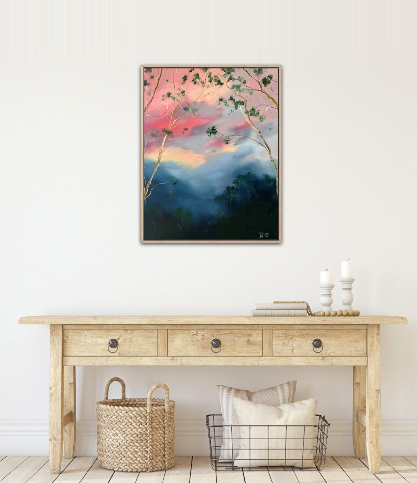 Inspired by the awe-inspiring beauty of a distant summer storm. Capturing nature, particularly the grandeur and majesty of towering trees. The artist uses a palette of pinks, peach, greys, dark greens, and gum tree blues to bring the scenes to life.