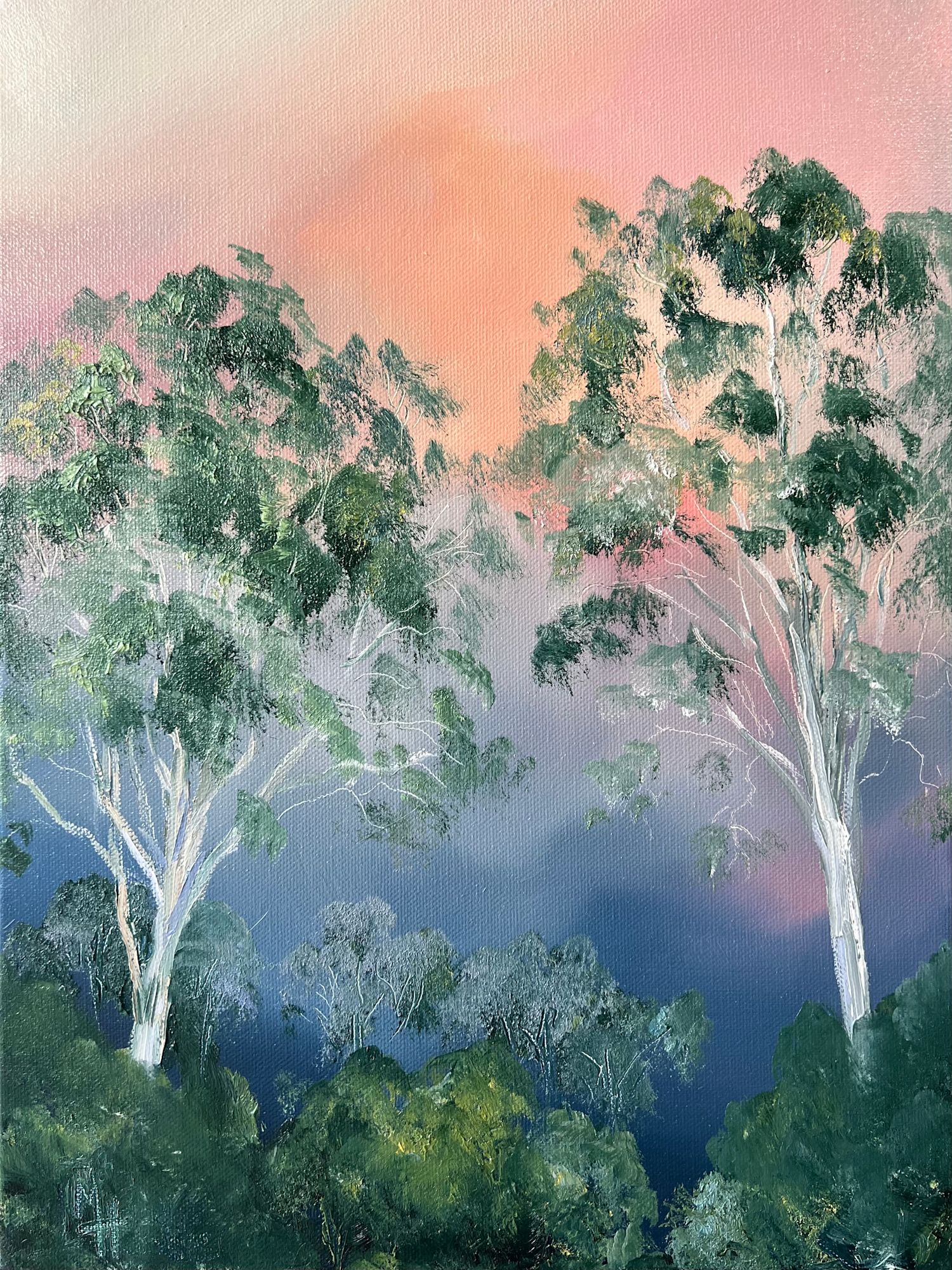 Inspired by the awe-inspiring beauty of a distant summer storm. Capturing nature, particularly the grandeur and majesty of towering trees. The artist uses a palette of pinks, peach, greys, dark greens, and gum tree blues to bring the scenes to life.