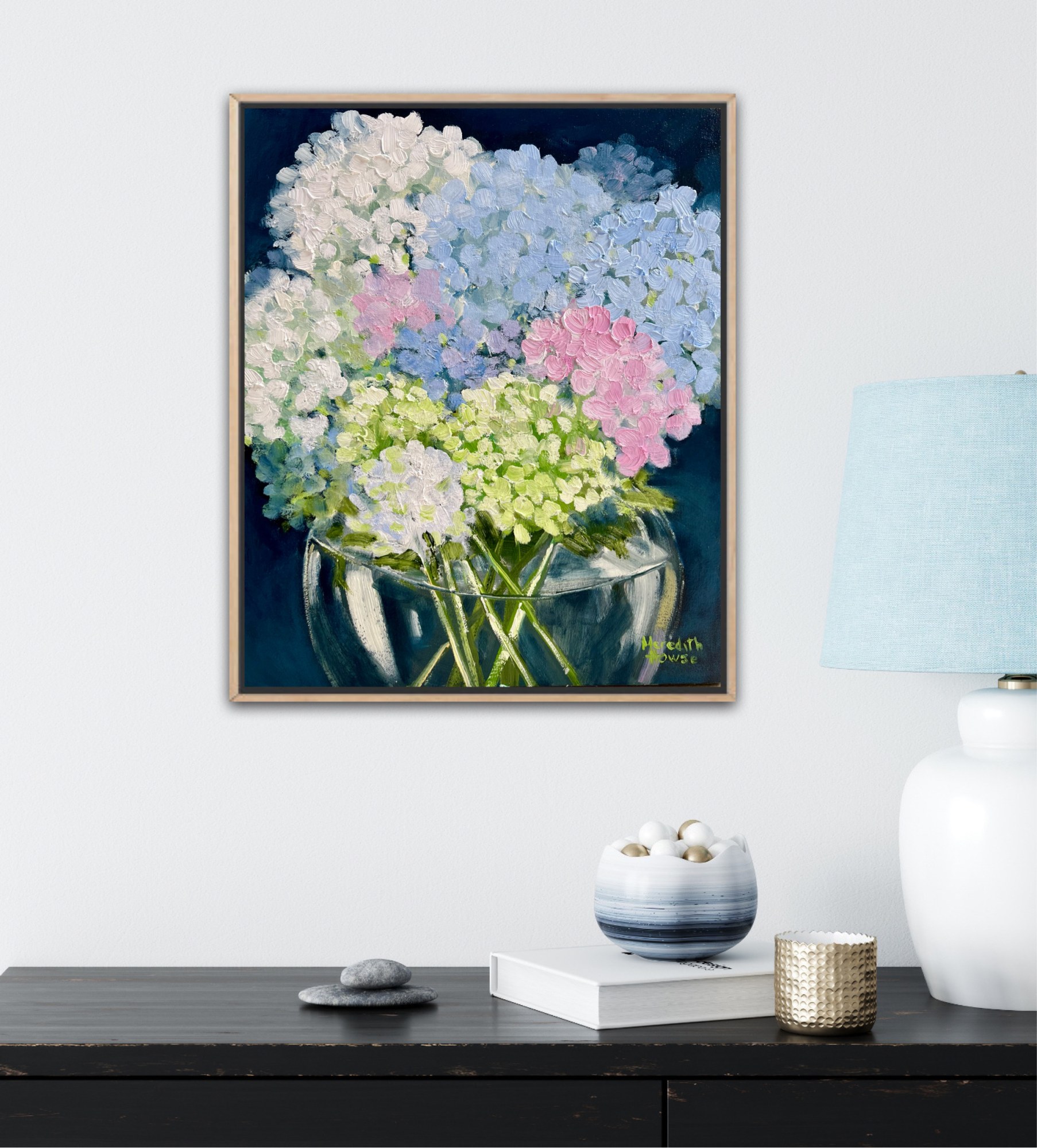 'Just for You' captures the delicate beauty of fresh Hydrangea flowers in a glass vase. The painting features a range of soft and subtle colours, including light greens and pinks, with a dark background that adds a touch sophistication to the artwork.