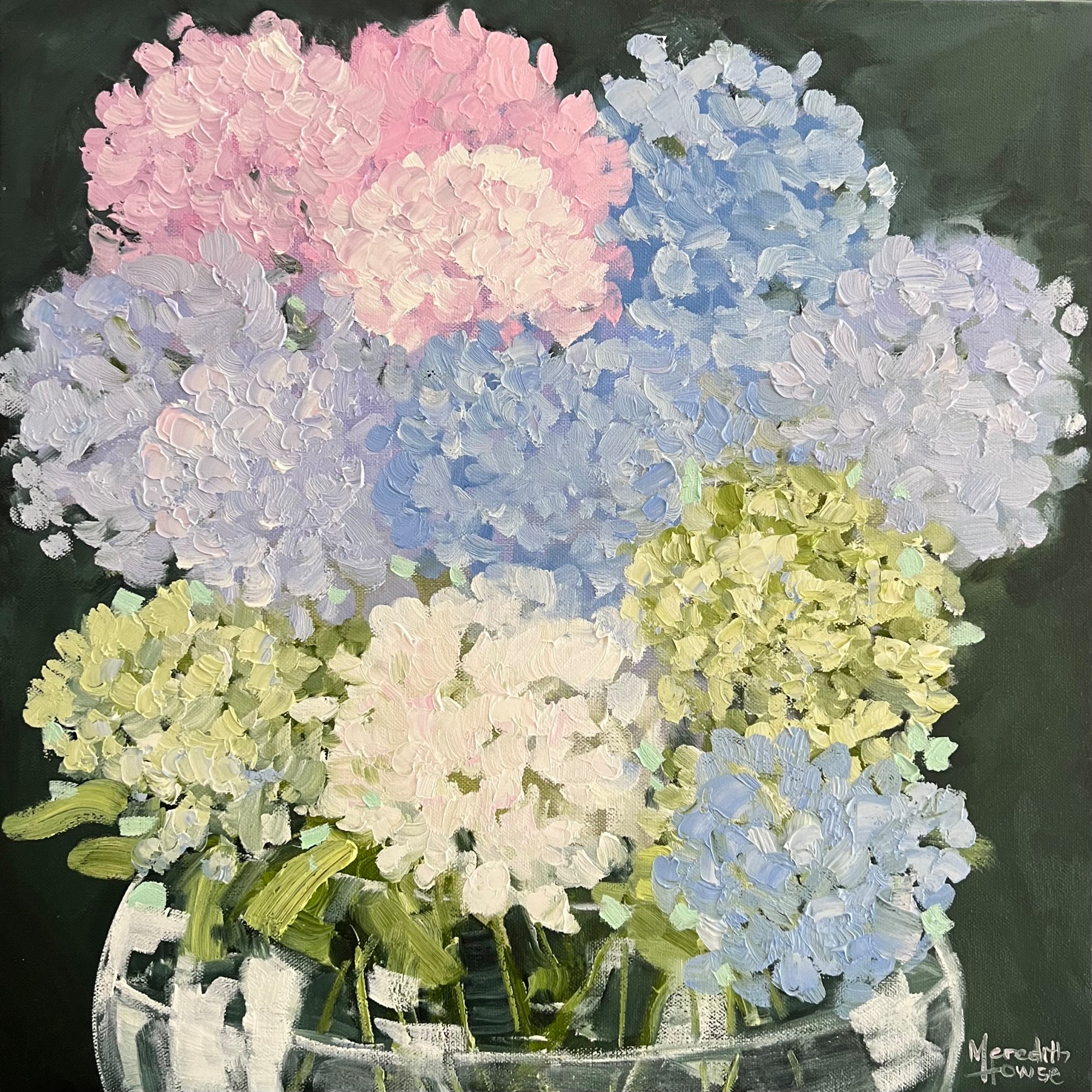 'Just for You Too' captures the delicate beauty of fresh Hydrangea flowers in a glass vase. The painting features a range of soft and subtle colours, including light greens and pinks, with a dark green background that adds a touch sophistication to the artwork.