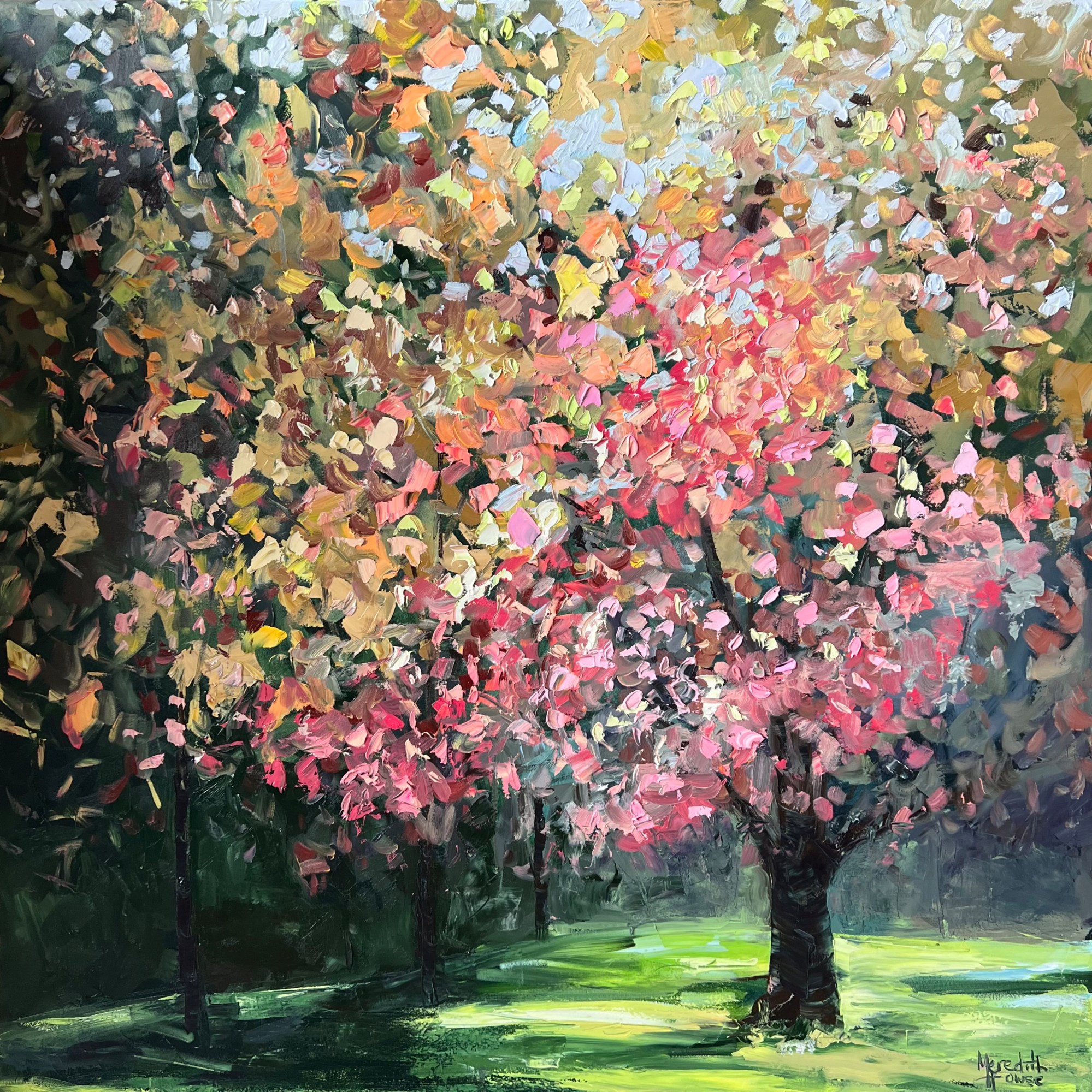'Nana Glen' by Meredith Howse is an colourful oil painting inspired by the vibrant autumn leaves of Archie Hunter Memorial Park in Nana Glen, NSW. This textural piece presents a composition of colour, movement, and light, immersing the viewer in the beauty of Autumn.