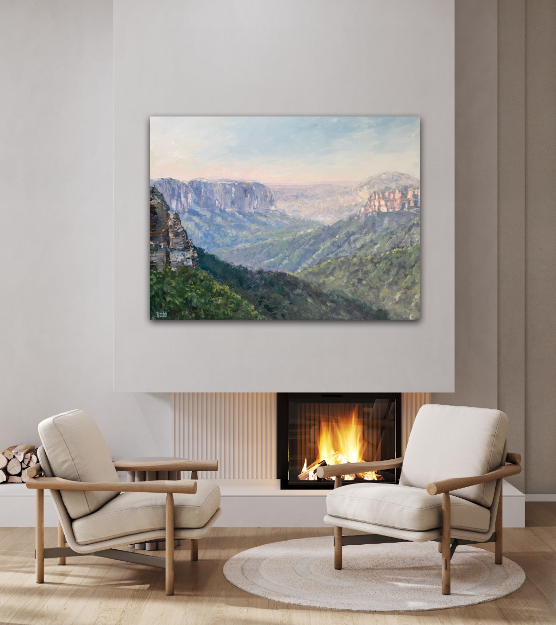Painted with a blend of impressionism and realism, the artwork showcases a painterly technique, bringing the scene to life through nature's colours. The canvas is alive with the green of the trees, the blue and grey of the sandstone and shale rock formations, and the atmospheric perspective of the landscape.
