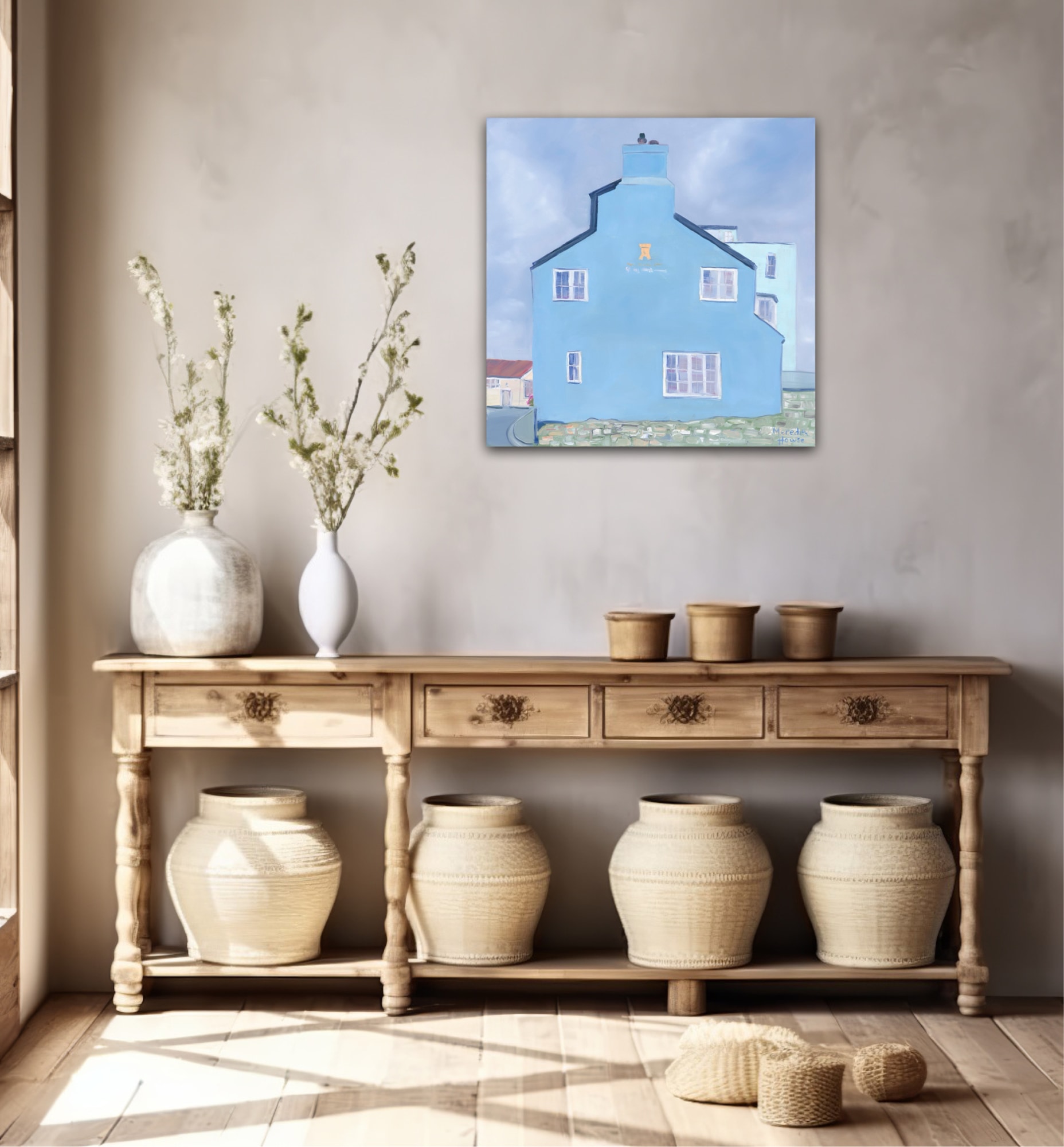 Rock Point Inn is inspired by the unique architecture of a beautiful coastal village called Lyme Regis in Dorset , England. Painted in a minimalistic style with blues and greys.
