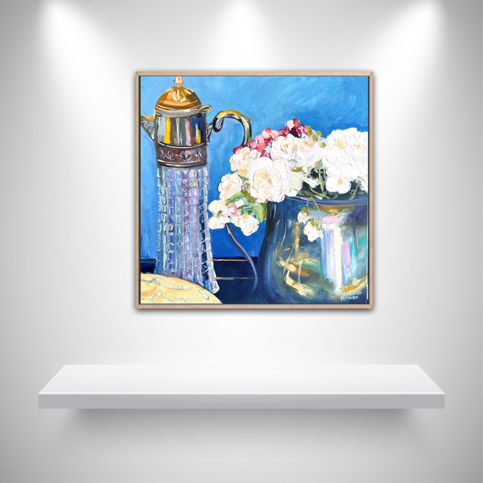 Roses of Blair Athol is a beautiful and colourful still life painting by Meredith Howse. The painting is inspired by the interior of the Blair Athol historic home in Inverell, NSW, and features a stunning array of roses, glassware, and silver antiquities.