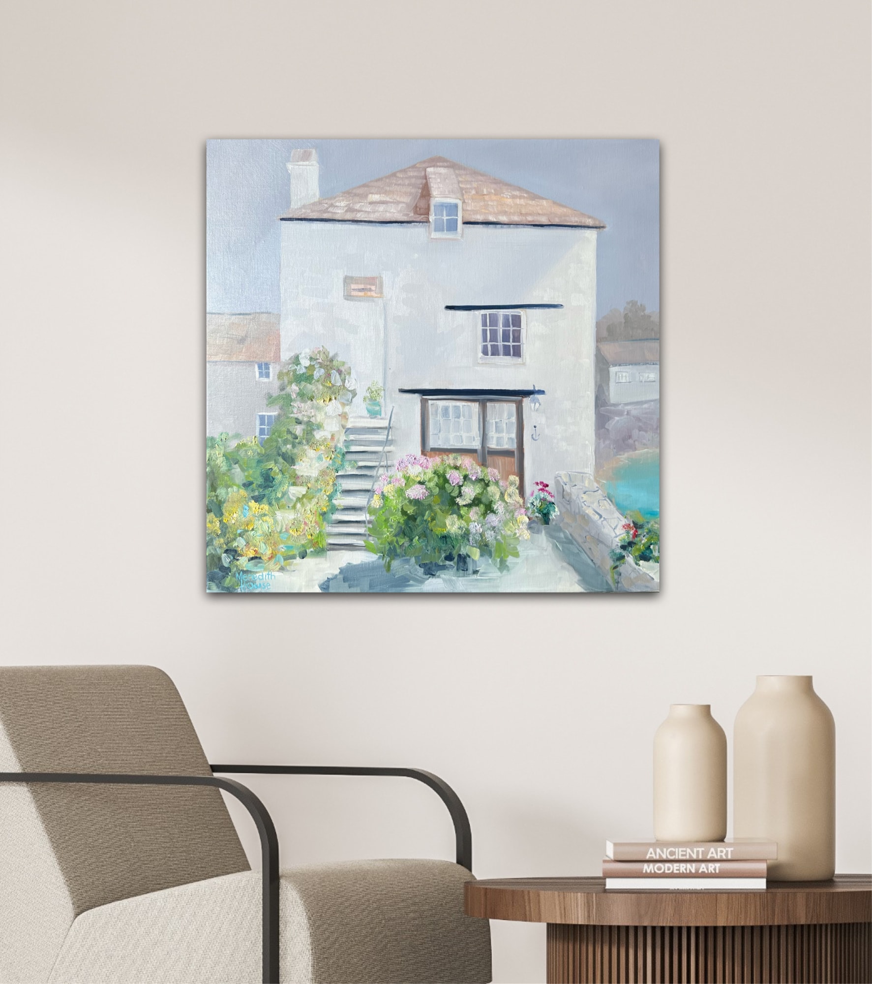 Seaside at Polperro is inspired by the unique architecture of the beautiful coastal village in Cornwall , England. Painted in a minimalistic style with blues and white.