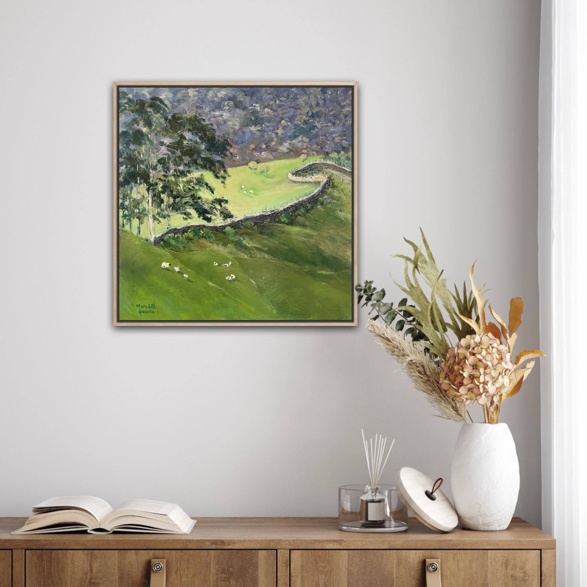 'Sheep at Hartsop' by Meredith Howse is an oil painting that captures the timeless beauty of the rolling paddocks in the Lakes District, United Kingdom. The artist skilfully brings to life the idyllic landscape, depicting lush, high green hills. The verdant hues of the fields create a sense of tranquility and convey the natural richness of the countryside.