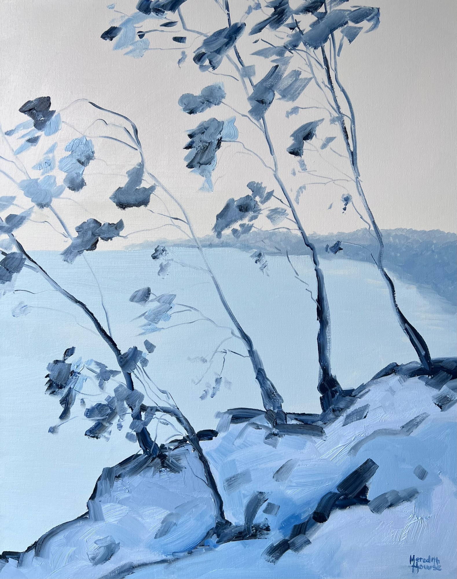 ‘Straddie in Blue’ by Meredith Howse beautifully captures the scenic view over the water to Main beach at Stradbroke Island. With a touch of artistic reimagining, the artwork presents a unique interpretation of the coastal landscape.