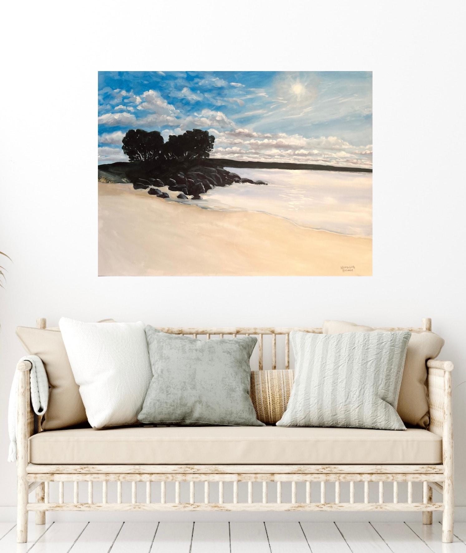 Meredith Howse's painting 'Sunshine at the Gardens, Tasmania', transports the viewer to a tranquil, small cove beach at the Gardens off Fancy Reef, in Tasmania's Bay of Fires. The artist's skilled use of light and colour captures the peacefulness of this idyllic scene, with the sun shining and the water gently lapping at the shore.
