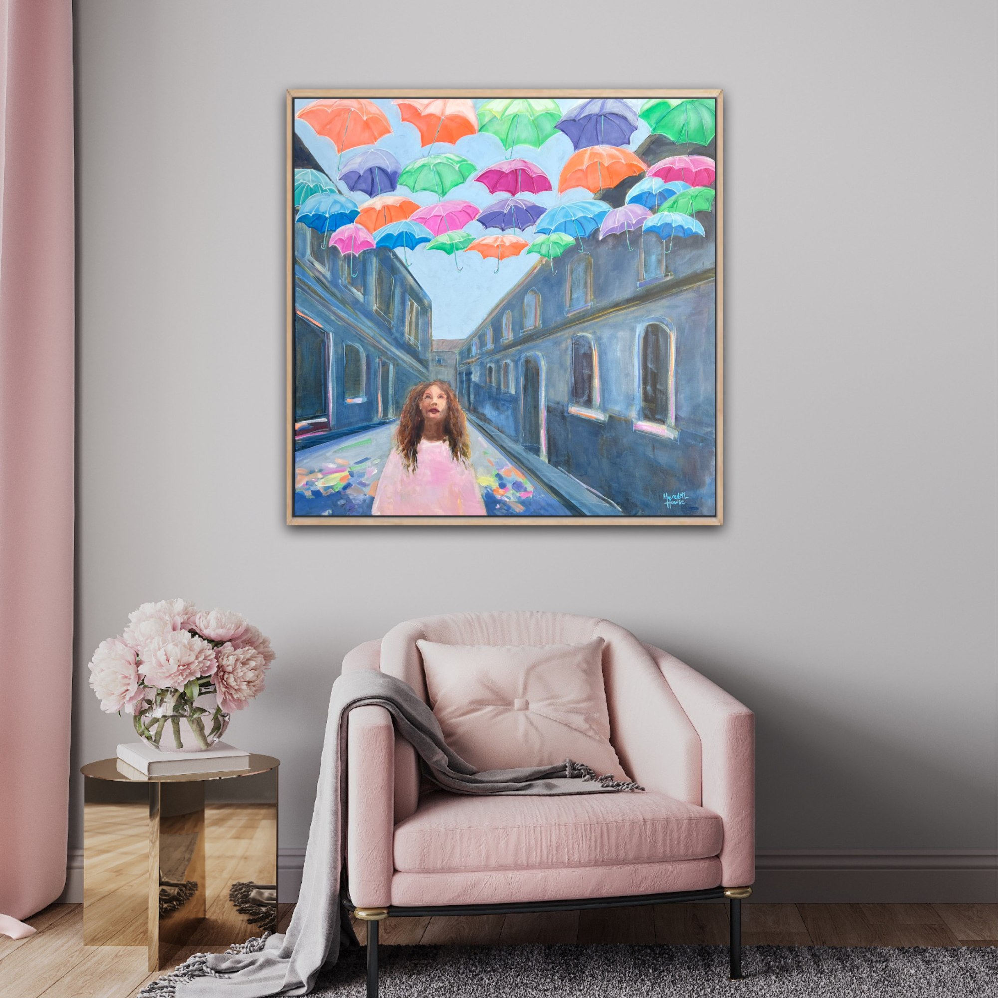 'Umbrella Colour Cascade' captures a moment of wonder as a young woman looks up to the sky. Above her, a sea of vibrant umbrellas creates a mesmerising canopy, casting a kaleidoscope of colours over the scene. The colourful umbrellas, suspended in the air, infuse the laneway with a lively, whimsical atmosphere.