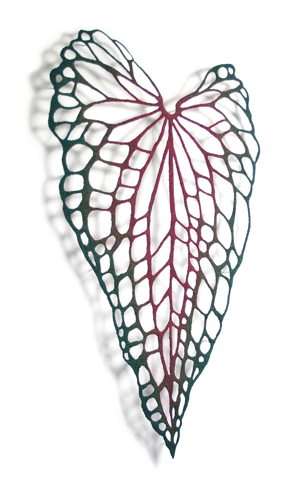 I have always been drawn to caladium leaves. Beautifully patterned and vividly coloured this is another example of a plant that is loved for its decorative foliage. The design for this piece was based on the cultivated caladium bicolour - 'Thai beauty', a stunning plant with heart shaped leaves with bright colouration.