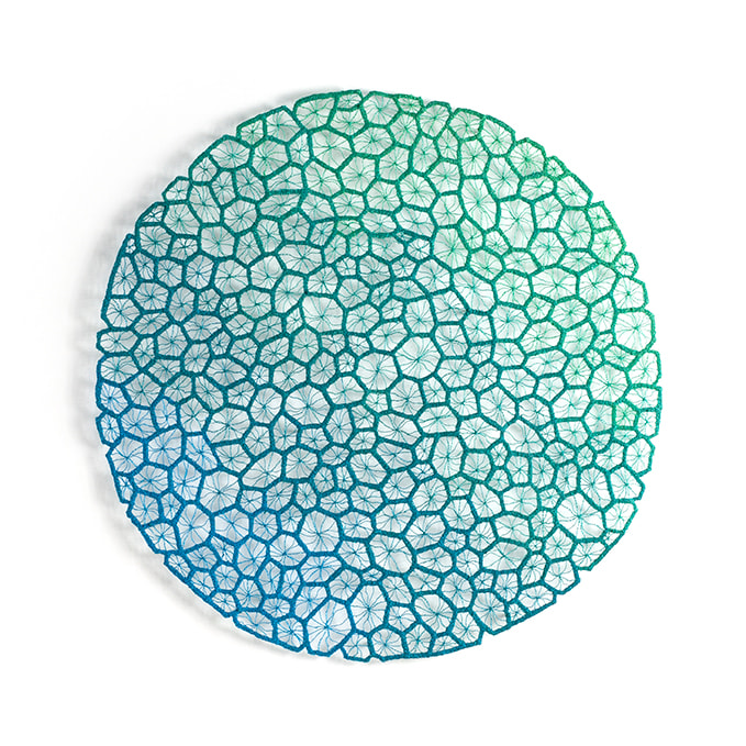 Circular embroideries inspired by different coral species.