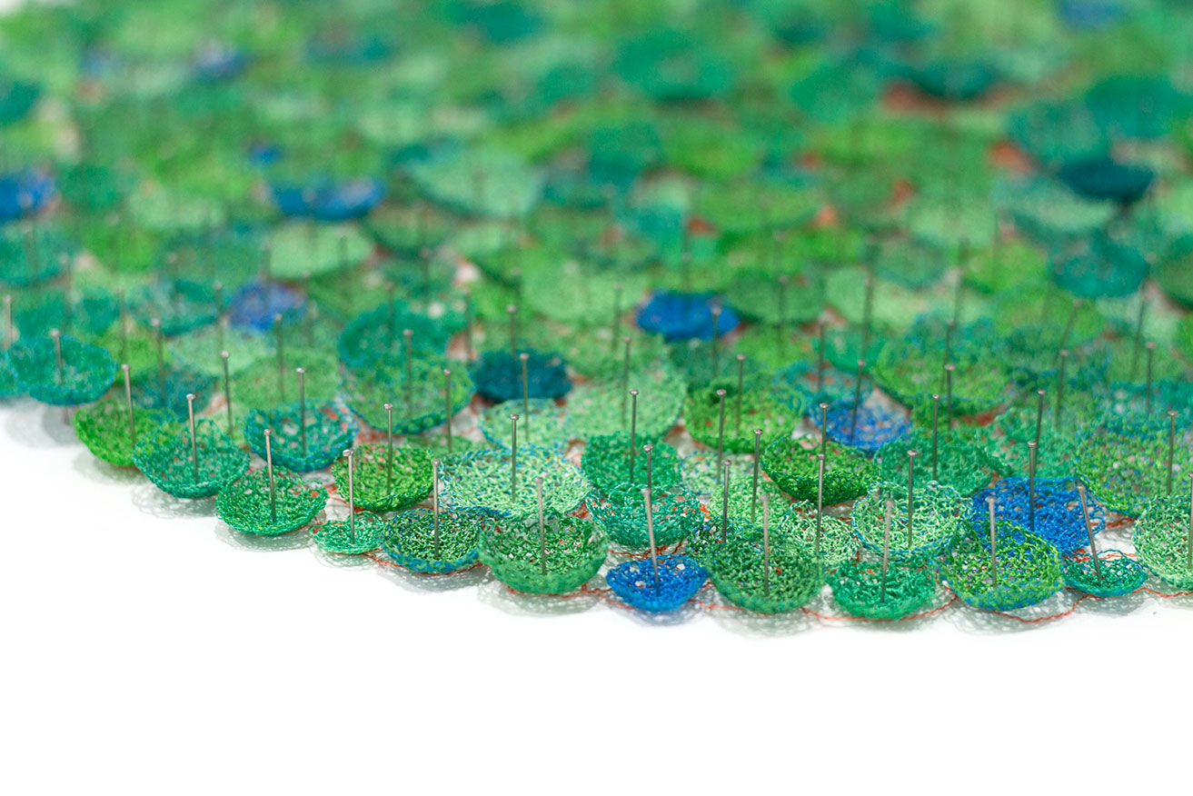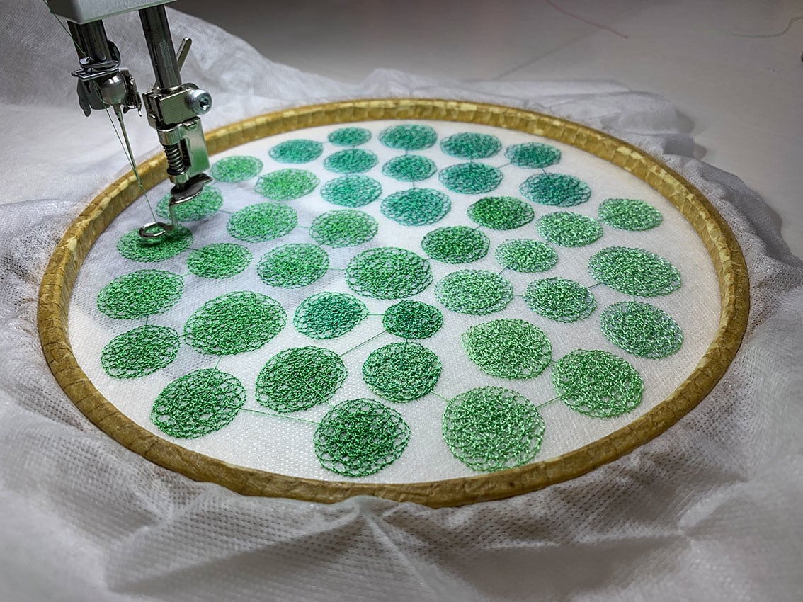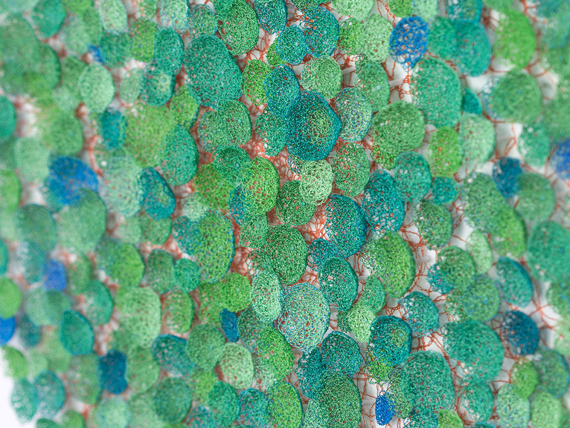 original embroidered artwork created for the Gibco 'Love your Cells' campaign made up of hundreds of shaped stitched cells.