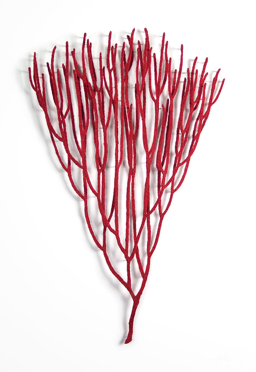Inspired by the soft coral known as a Red Sea whip (Leptogorgia chilensisand) its vibrant crimson colouring. This piece is unique because it has a double layered embroidery within the one piece.