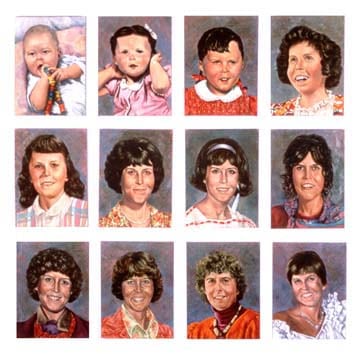 This is my "catch-up" self-portrait piece. I had the idea to do this while I was listening to a speaker on art and business. It came to me in a flash, that I was already too old to illustrate my aging with self-portraits as I was in my late 30's. So I thought I'd just do this piece of a dozen cookies (my life-long nickname) and then go on from there.