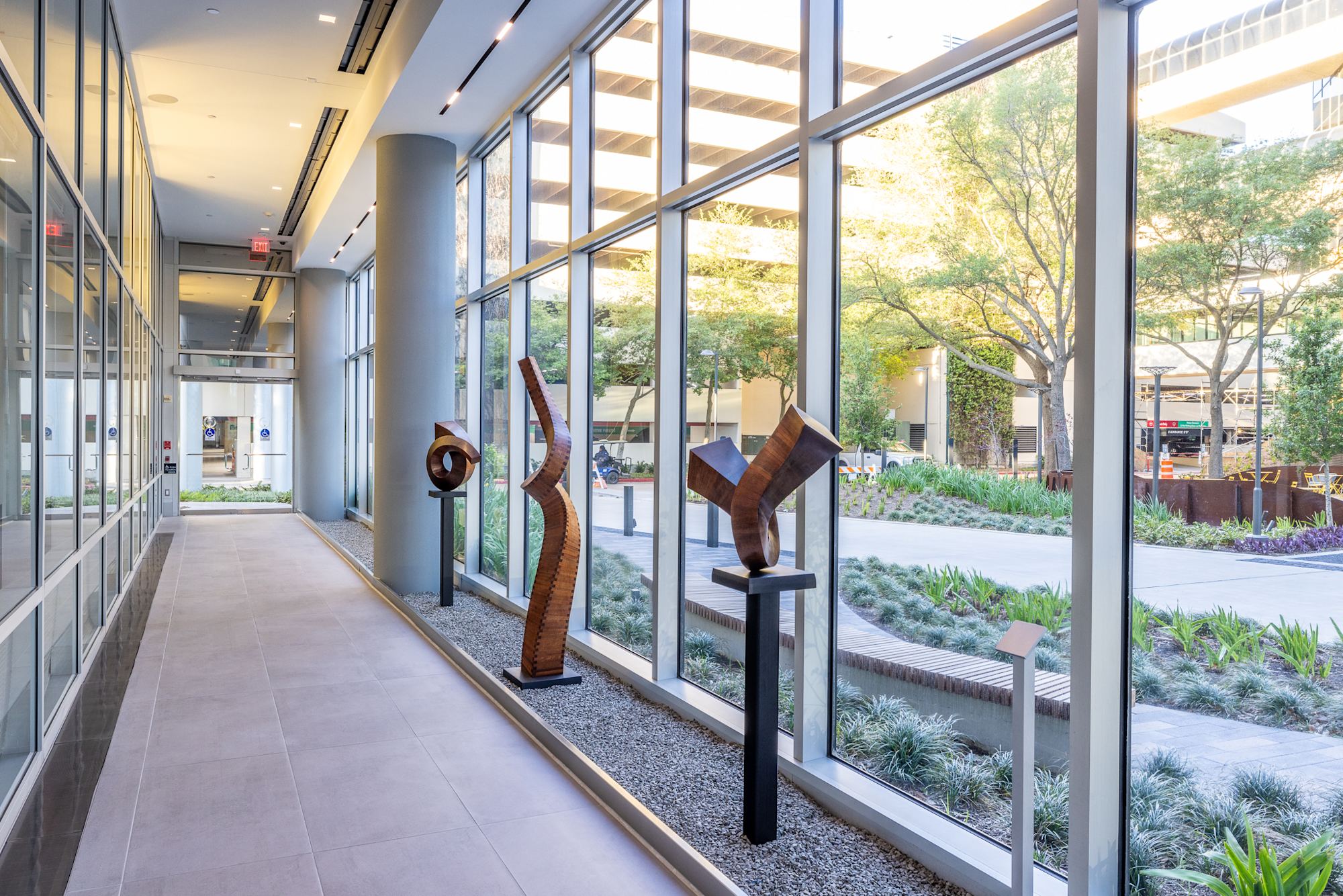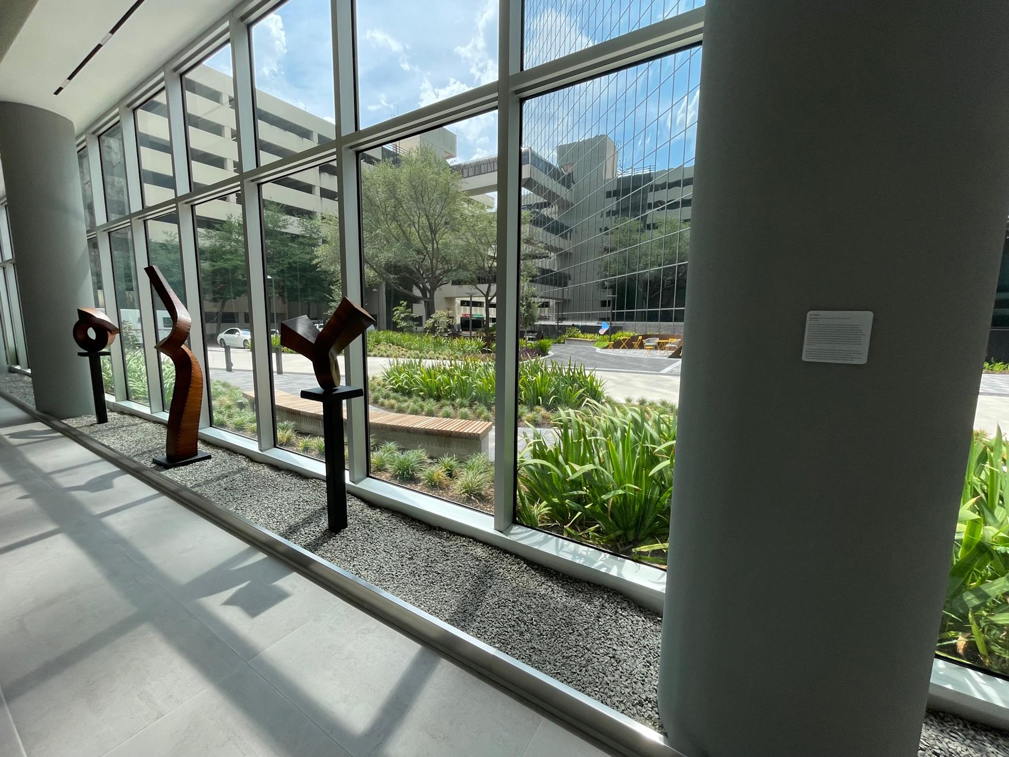 Glissade by Jim Perry  Image: Jim Perry began his career as a sculptor in the early 1970's in New York City, and in 1975 was included in the Whitney Biennial. He received his BA in Sculpture from Bard College where he studied with sculptor Jake Grossberg and painters Murray Reich and Jim Sullivan. he works with mahogany using small angular cuts of wood that when layered, create large, dynamic, abstract sculptures; totems, spiraled and flowing pieces. Jim Perry's work has been exhibited extensively over the past 45+ years and is held in many private and corporate collections. "I am fascinated by forms that are both mathematical, like parabolas or spirals, and that also appear in nature, like waves or flight trajectories. In my sculpture, I take the basic principles inherent in these forms and interpret and play with them, allowing each piece to evolve in an intuitive way."