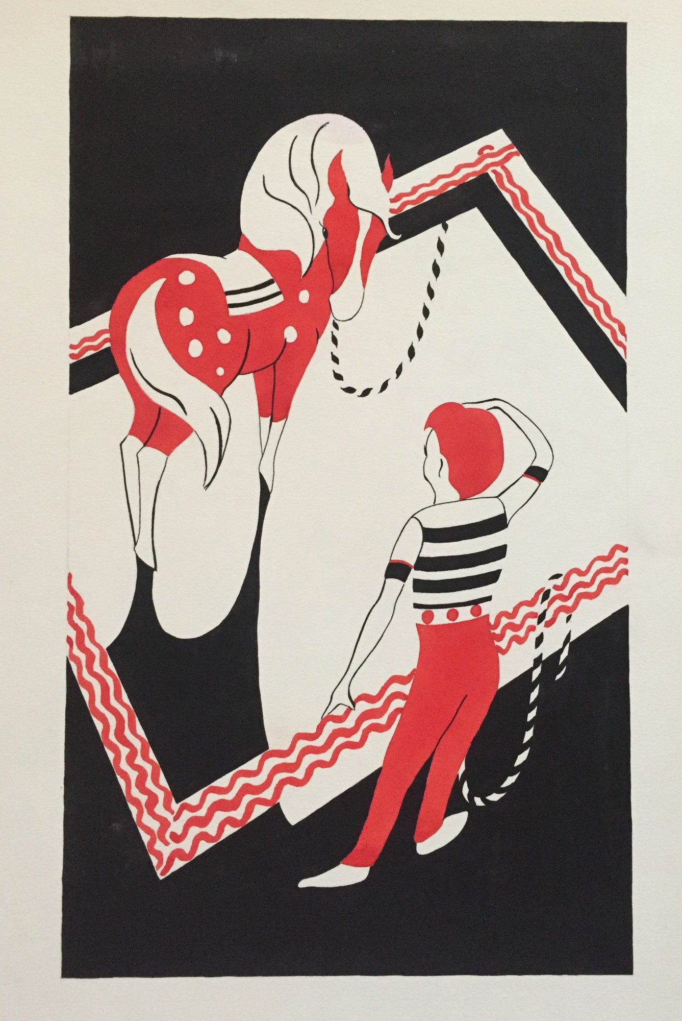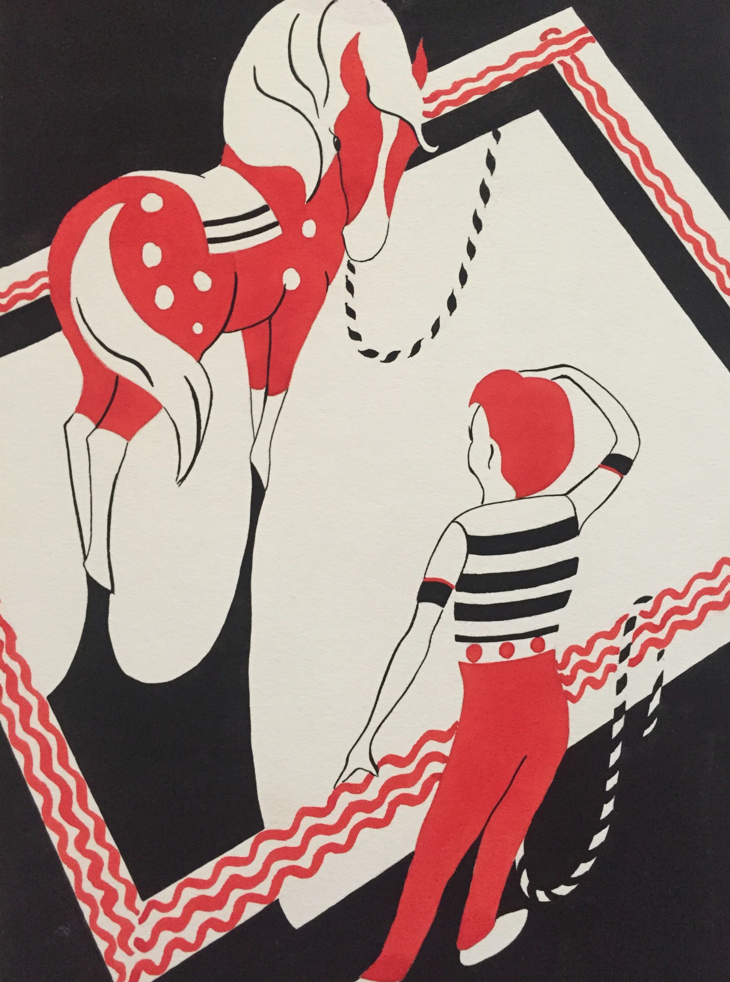 Original, gouache painting on illustration board. Horse and boy painting done with mid century graphic coolness. Student work by artist Christina A. Rodina. Label affixed on verso, dated Feb. 3, 1951, from Jackson, Minnesota. Board measures 10" x 15".