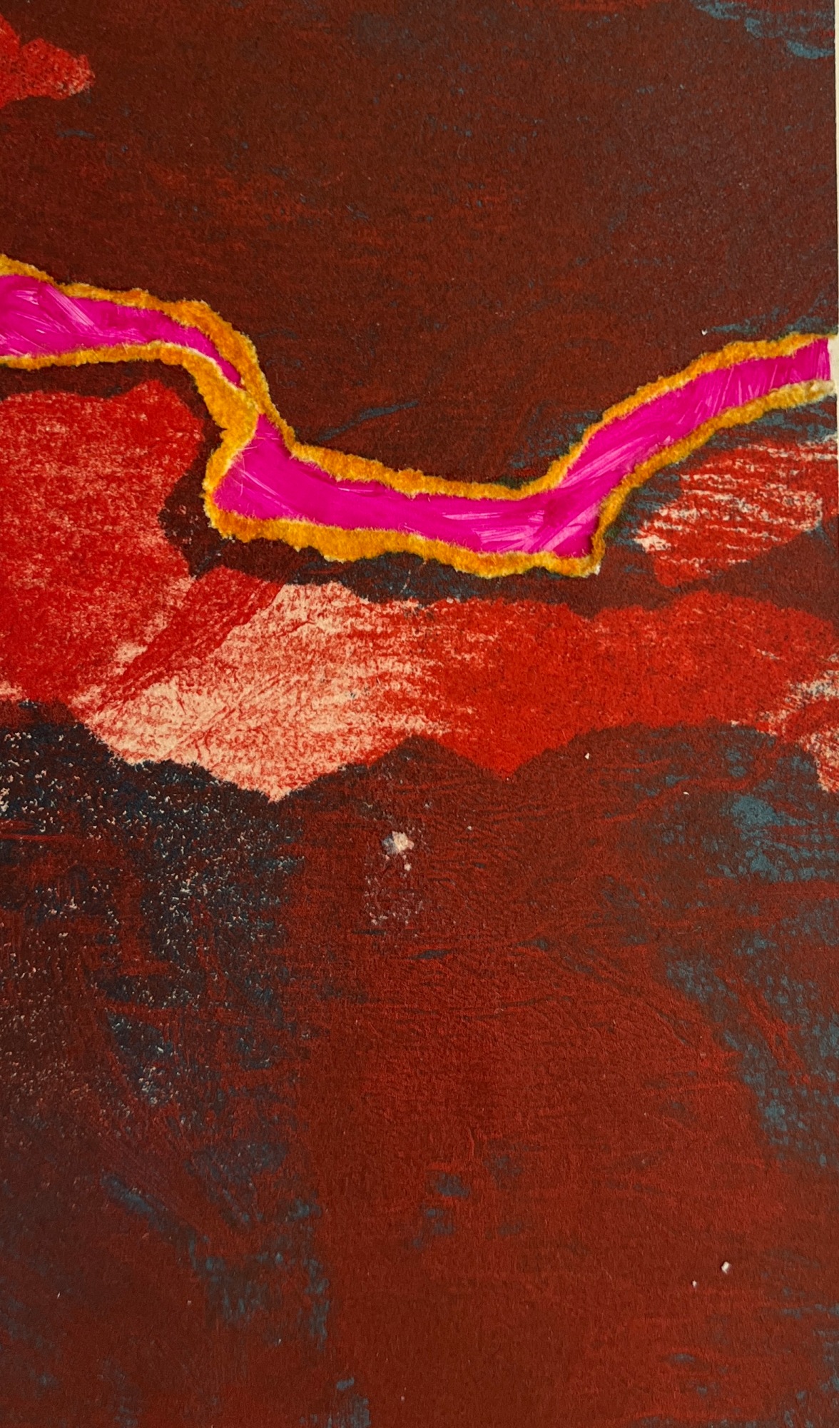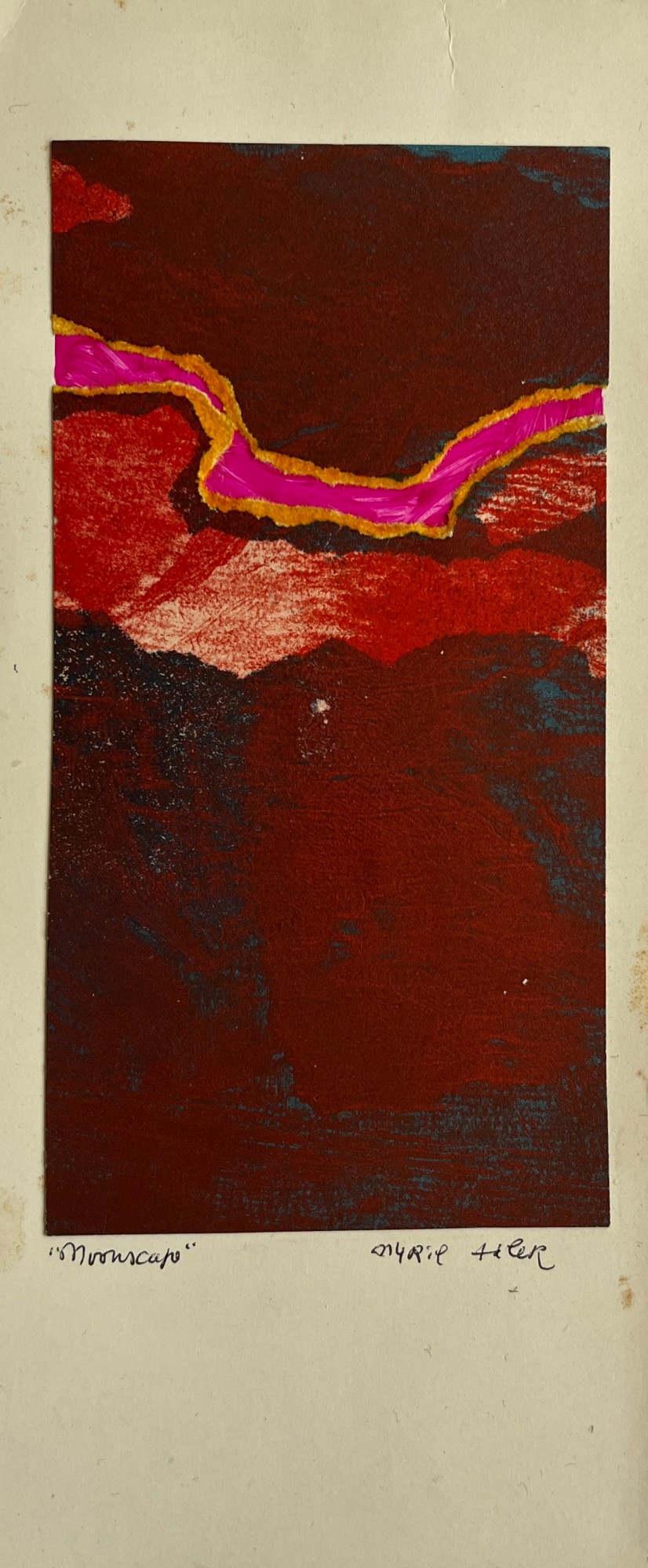 - 1960s "Moonscape" Red, Pink, Orange Collage Intaglio Etching NY Artist Myril Adler, 1960