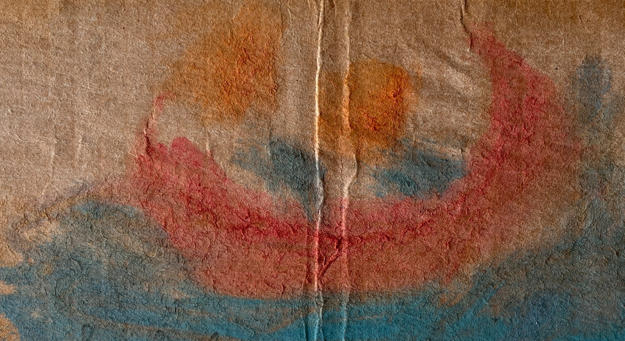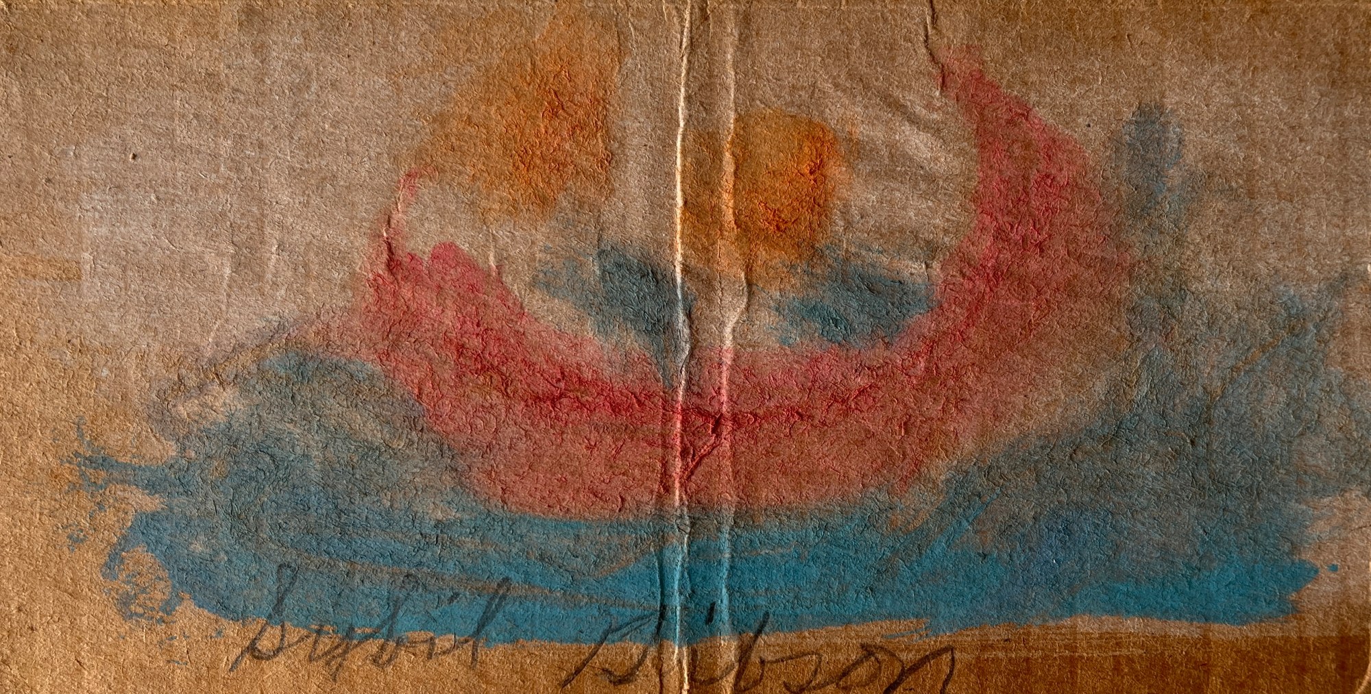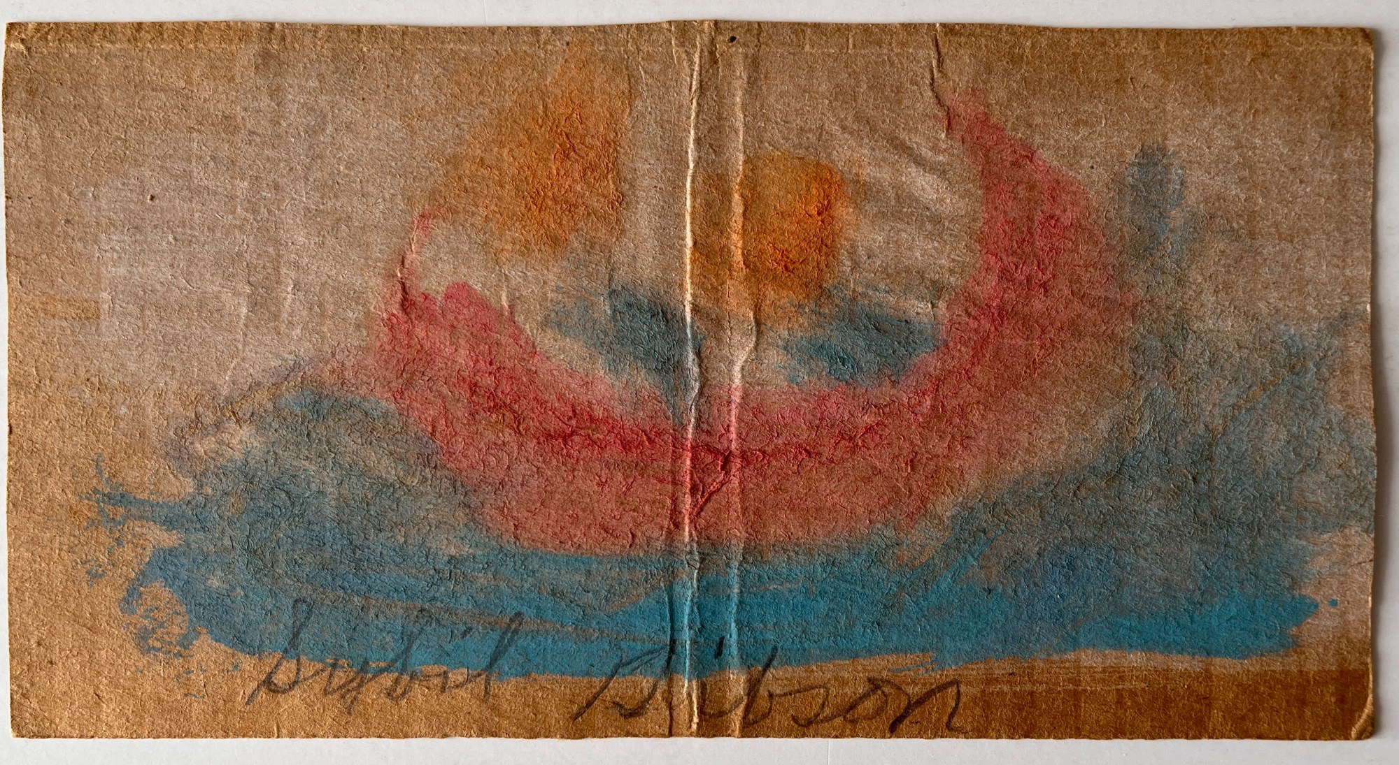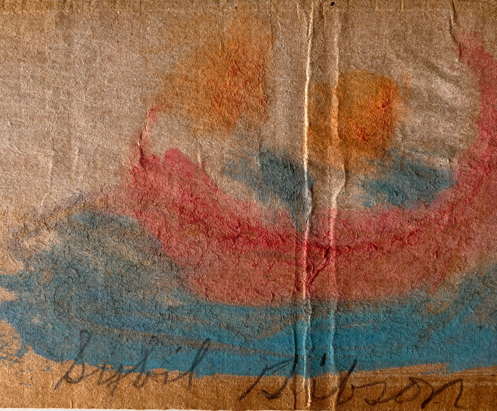 On Thanksgiving day in 1963, she decided to make some Christmas wrapping paper from brown paper bags and was overjoyed with and altered by that experience. She once commented, “Good art paper turns me off, while something out of a trash pile turns me on.” Sybil employed an unusual technique of washing the glue from the paper bags to flatten them while wet to form her favorite surfaces on which to paint. Her fluid brushstrokes imparted a unique style, graceful and minimal with great control of the paint.