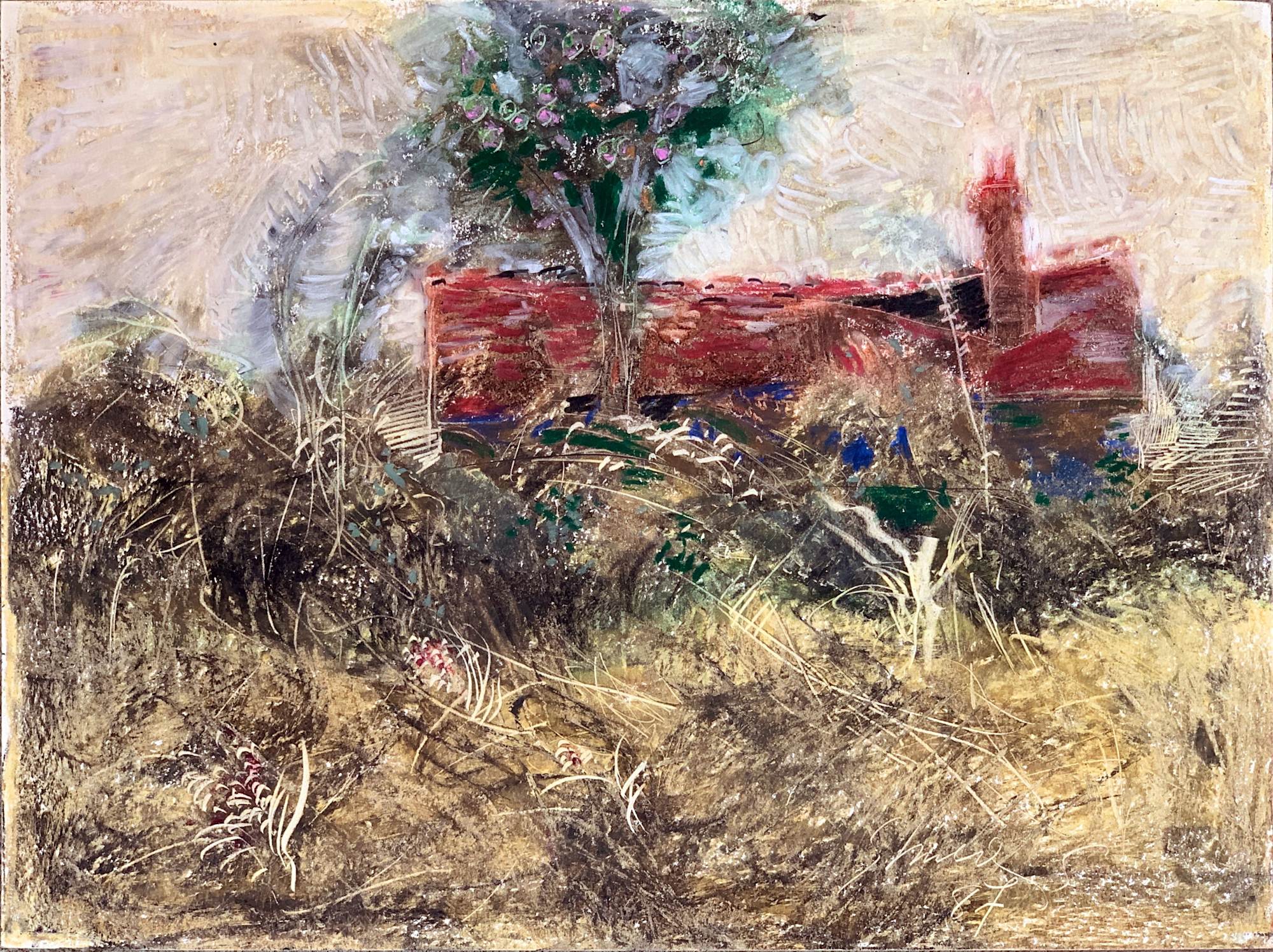 - 1987 "Roadside Cabin, France" Abstract Landscape Painting Acclaimed Illustrator Bill Shields, 1987
