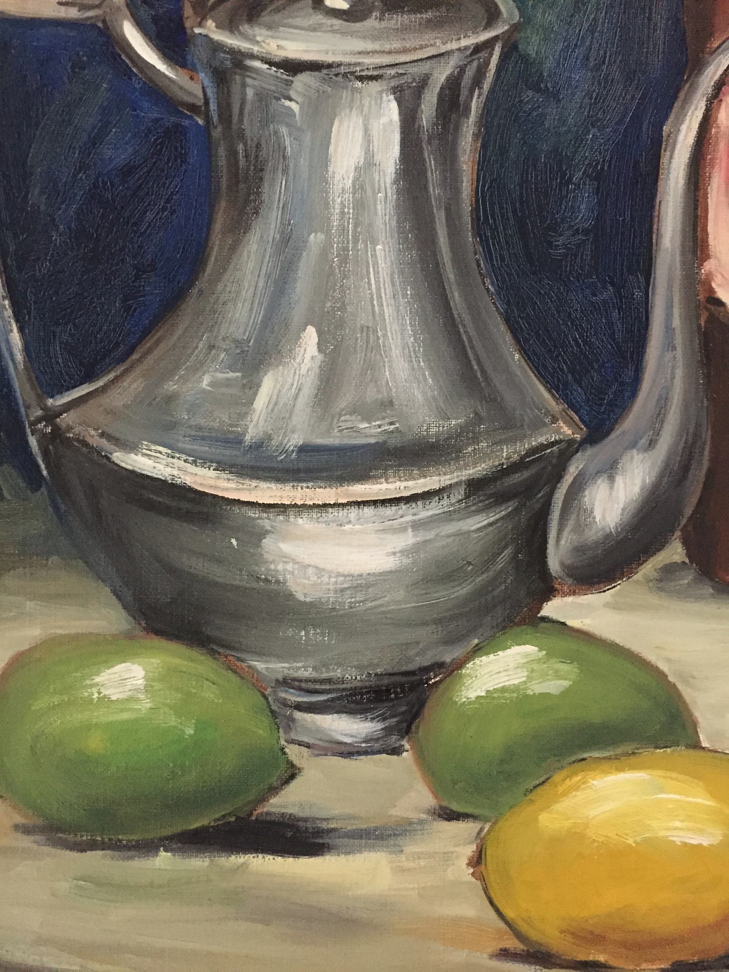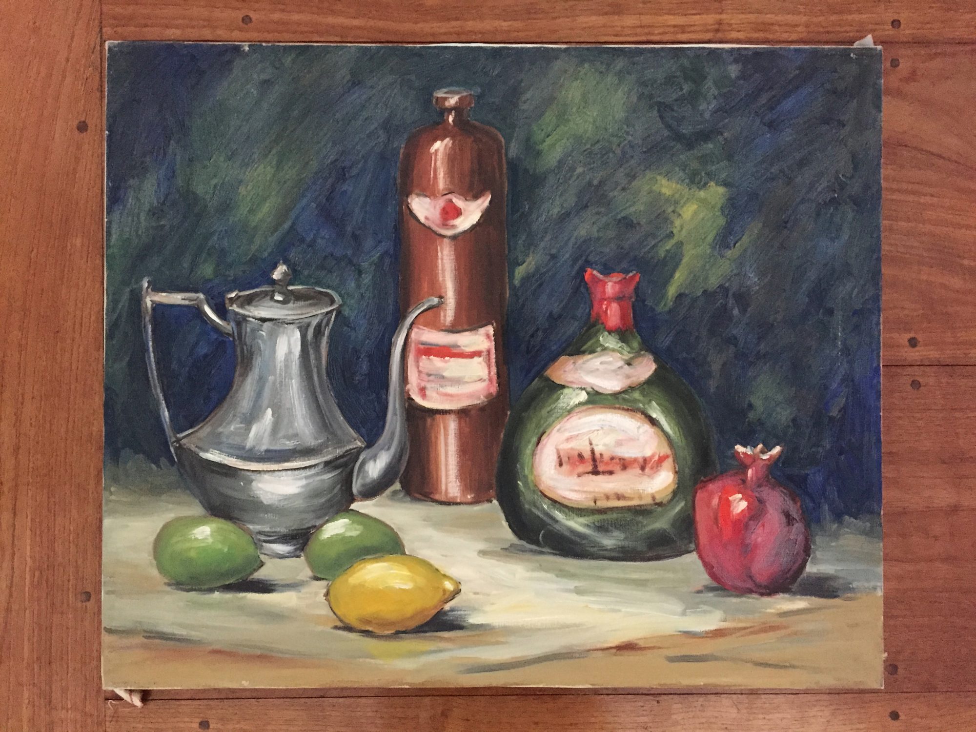 Mid Century, oil still life painted on stretched canvas. Attributed to Clifford Holmes (1876-1963) of California. Unframed, measures 24" x 20", c. 1950's. This piece was acquired from collector of his works in Alameda, CA. Mr Holmes was a teacher at California College of Arts and Crafts in Oakland, CA.