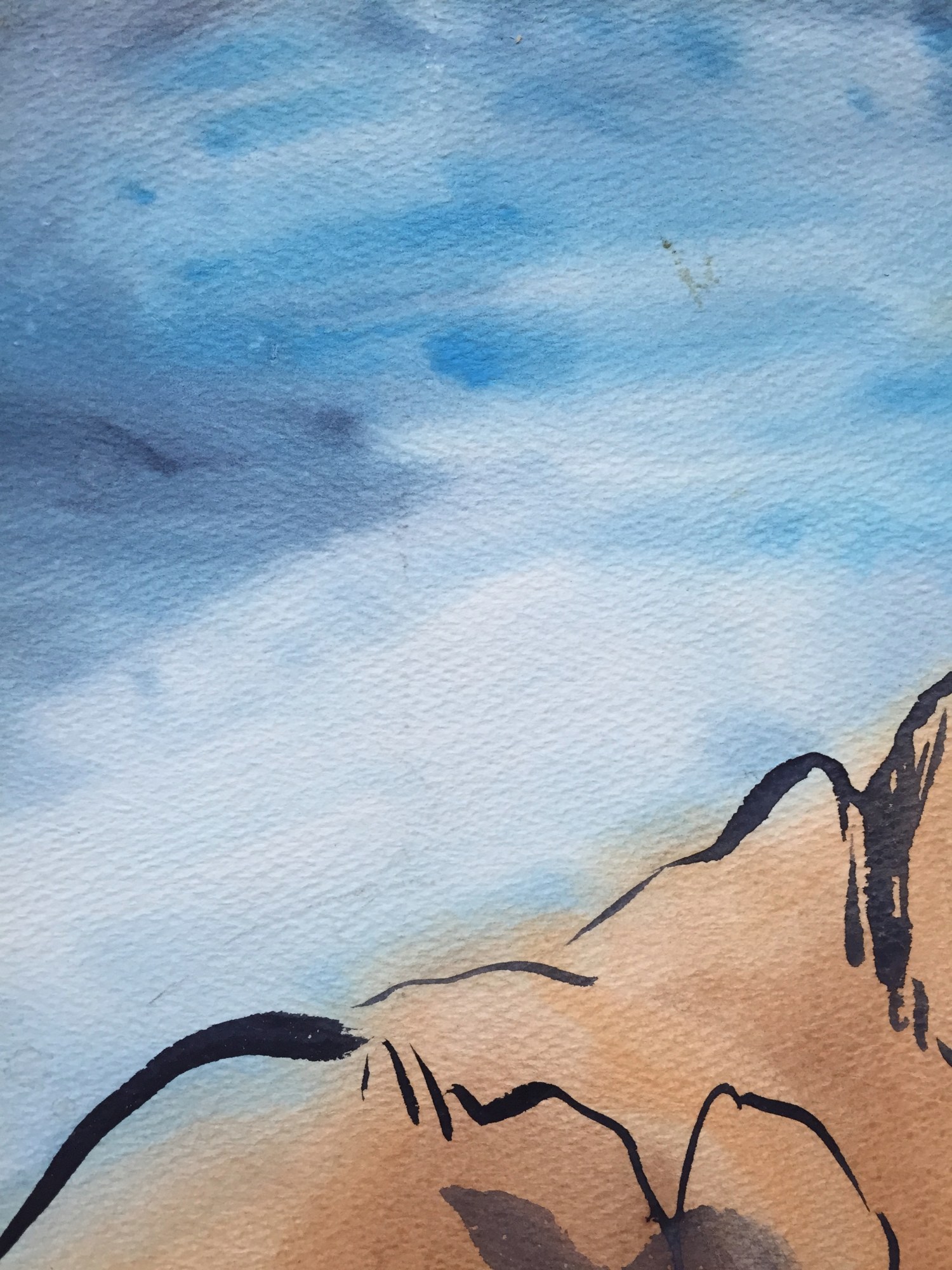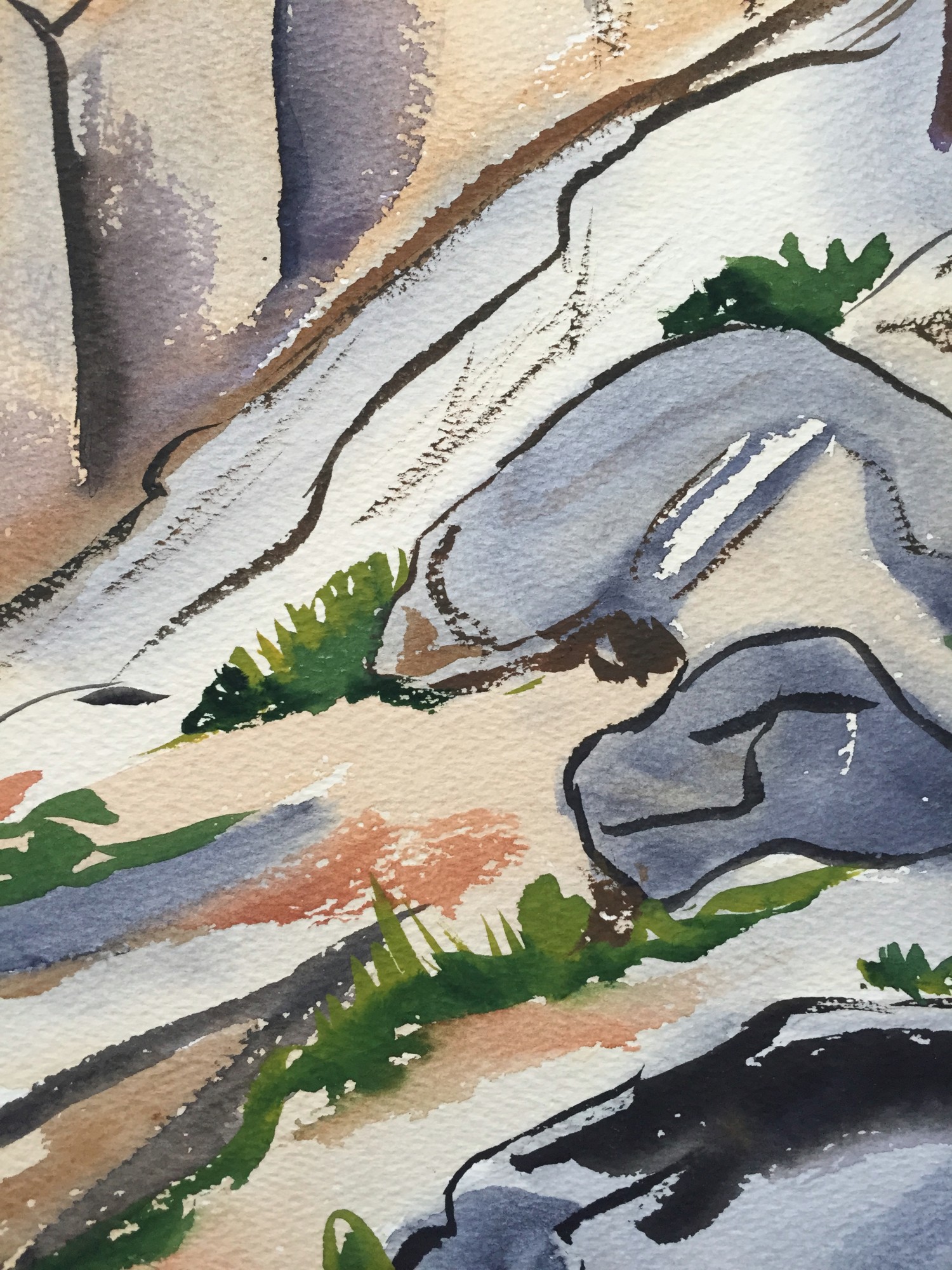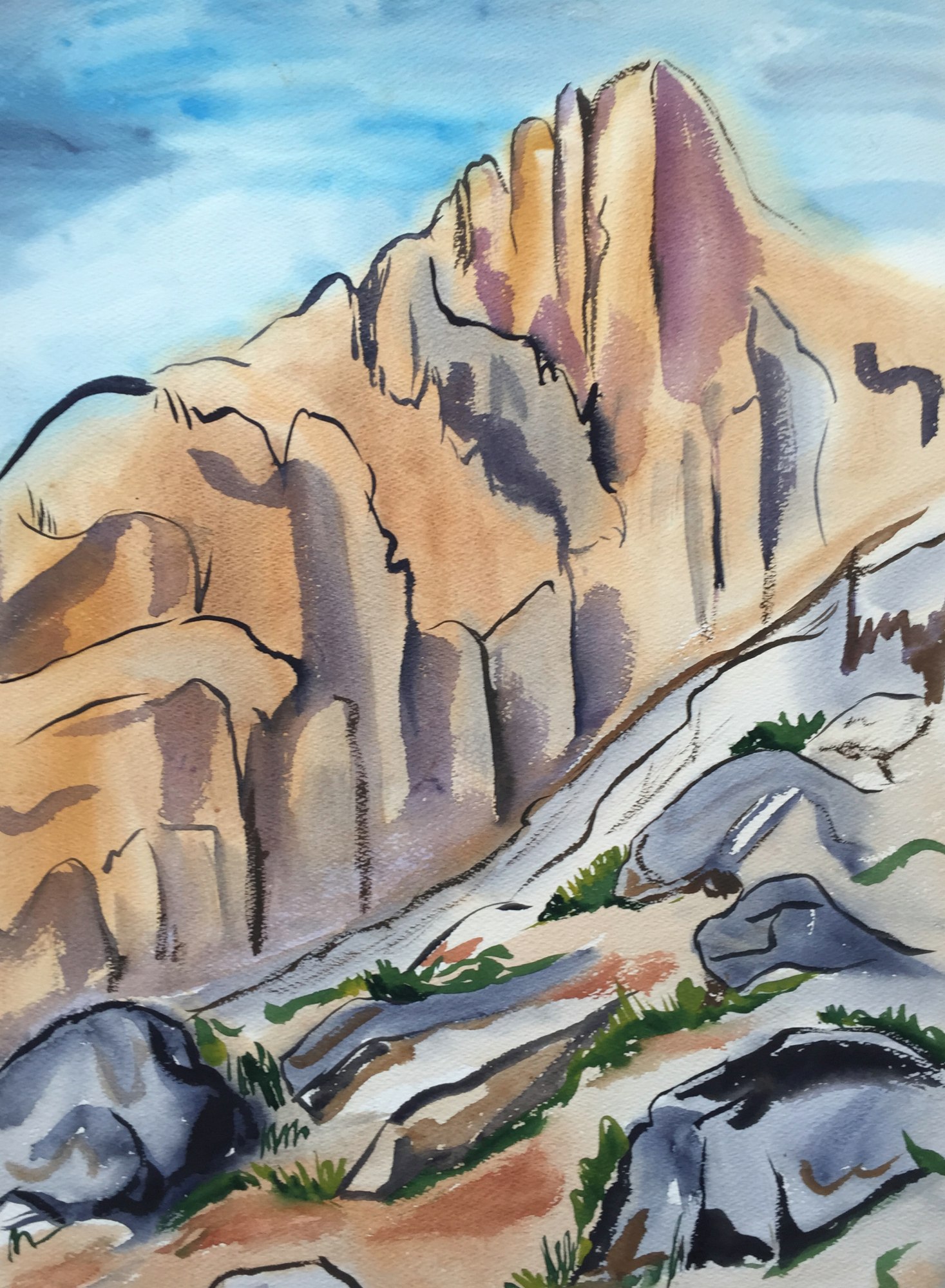 Lovely, mid century watercolor painting, by artist Thelma Corbin Moody (1908-1986) of Modesto, CA. This piece is unsigned and came from a large portfolio of her work, c.1960's. Expressionist painting is of a mountain landscape done in pastel colors. Unframed painting is done on watercolor paper, measures 15" x 22".
