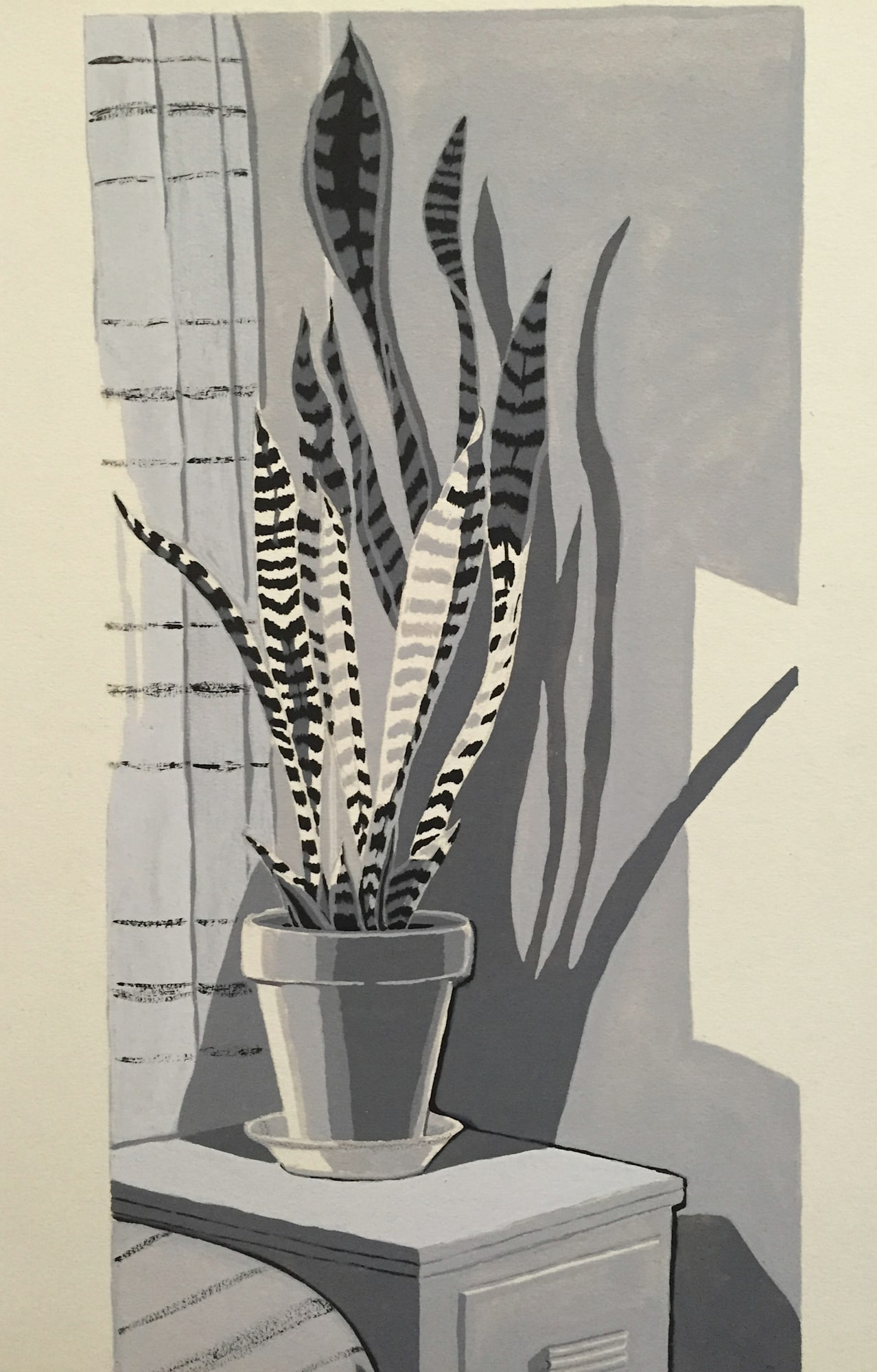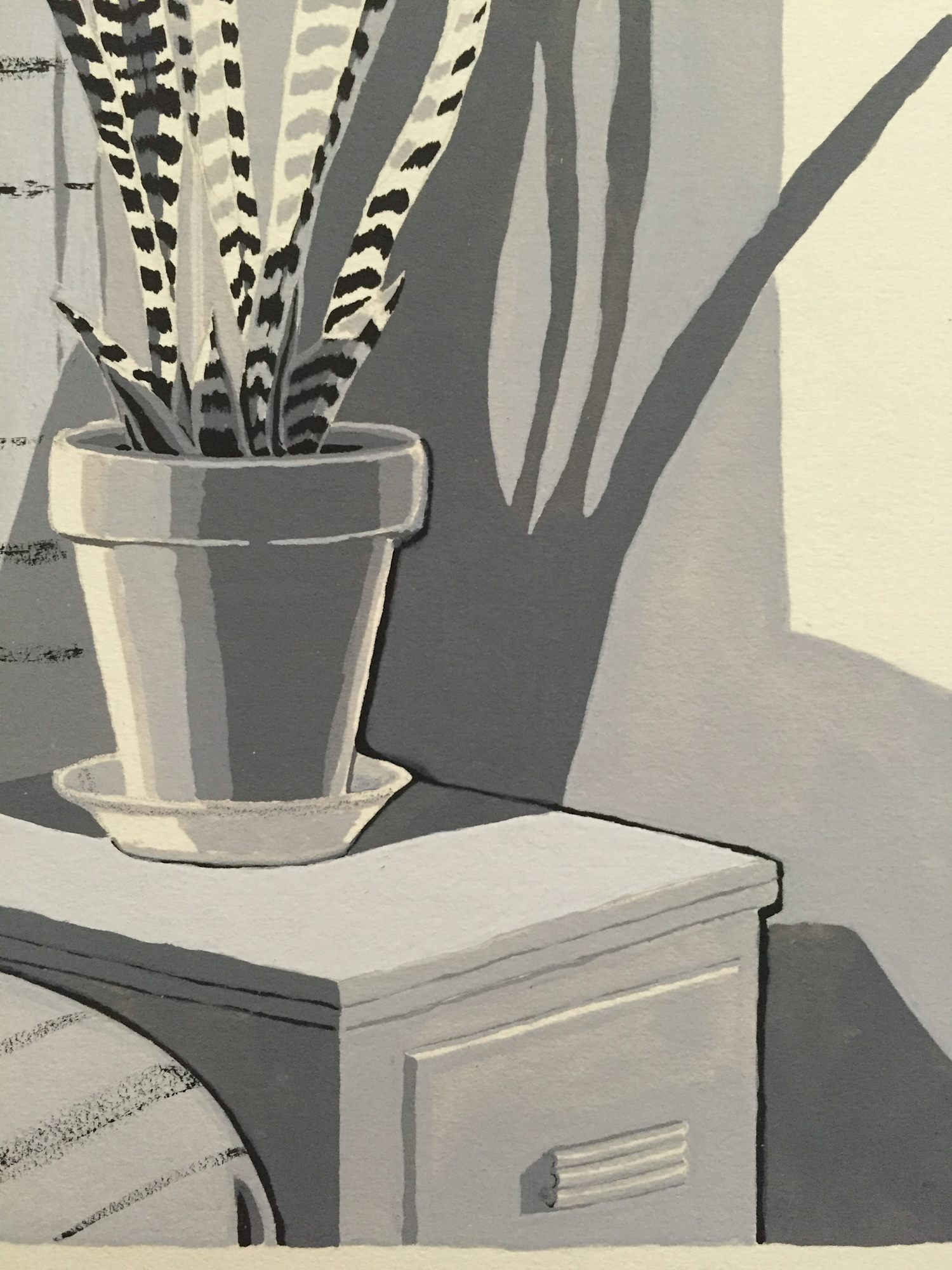 Original, gouache painting on illustration board. Still life of a plant on a side table. Done in greys and black. Student work by artist Christina A. Rodina. Label affixed on verso, dated Feb. 27, 1950 from Jackson, Minnesota. Board measures 10" x 15".