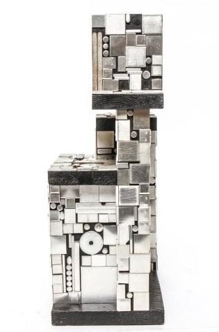 Industrial metal and wood tabletop sculpture consisting of small blocks of black-painted wood arranged in staggered linear form, covered with aluminum washers, dots, squares, and bars, mounted on a black-painted wood base.