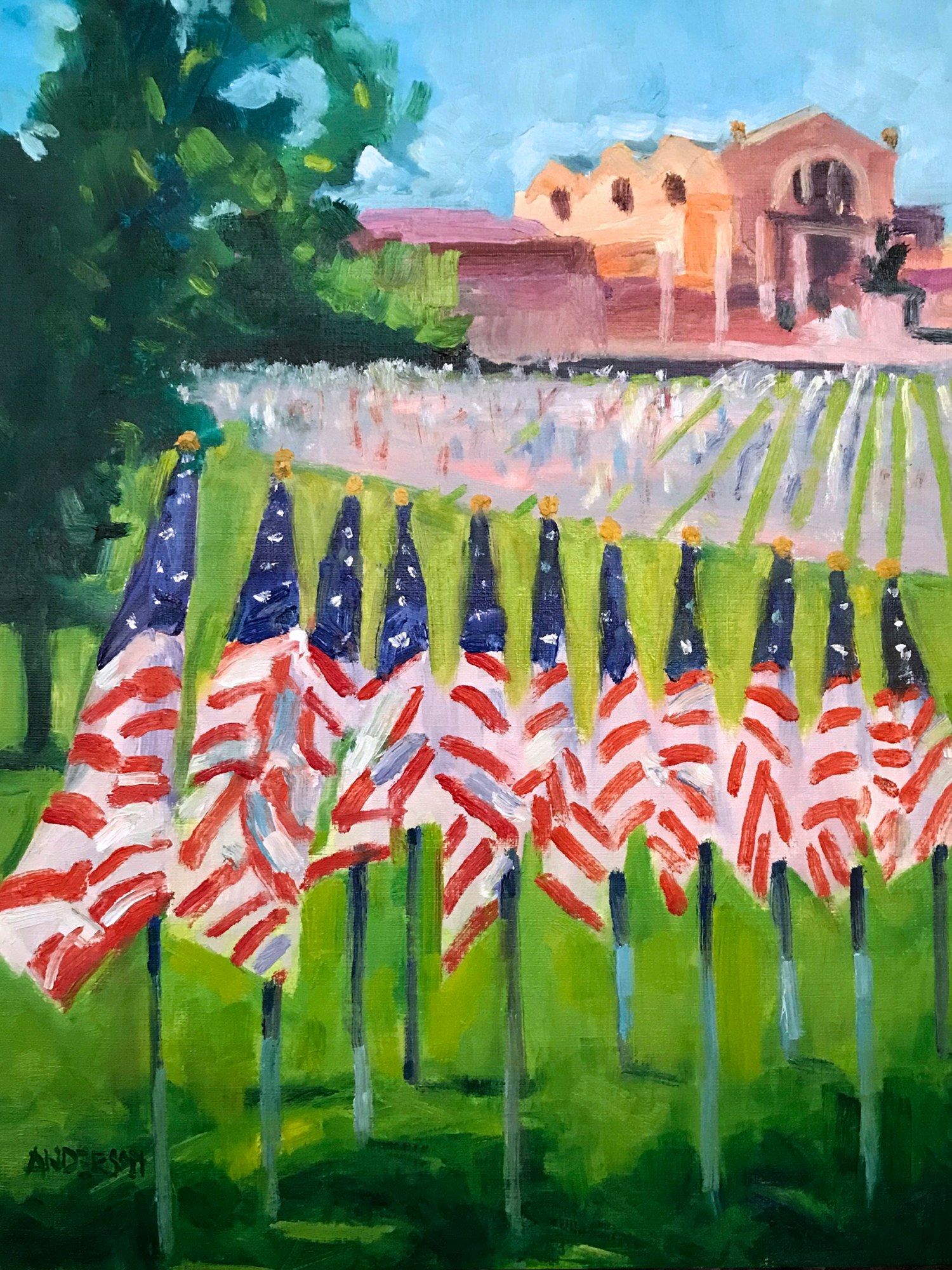 Plein air painting results at the Flags of Valor event in Forest Park. U.S. flags are displayed on Art Hill on every 5 year anniversary of 9/11. In 2021 there are 7600 flags each bearing the name of an individual hero or victim lost on that tragic day as well as a service member lost in war since 9/11/01. Price includes gallery frame, white. Proceeds from the sale of this work will be donated in the buyer's name to the non-profit Flags of Valor.