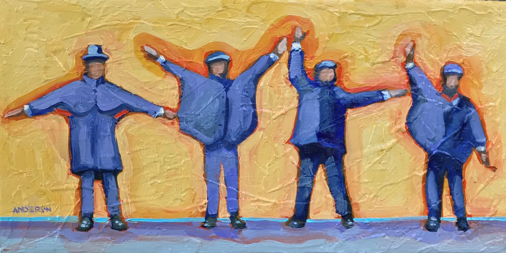 Beatle-esque figures painted on heavliy textured canvas.