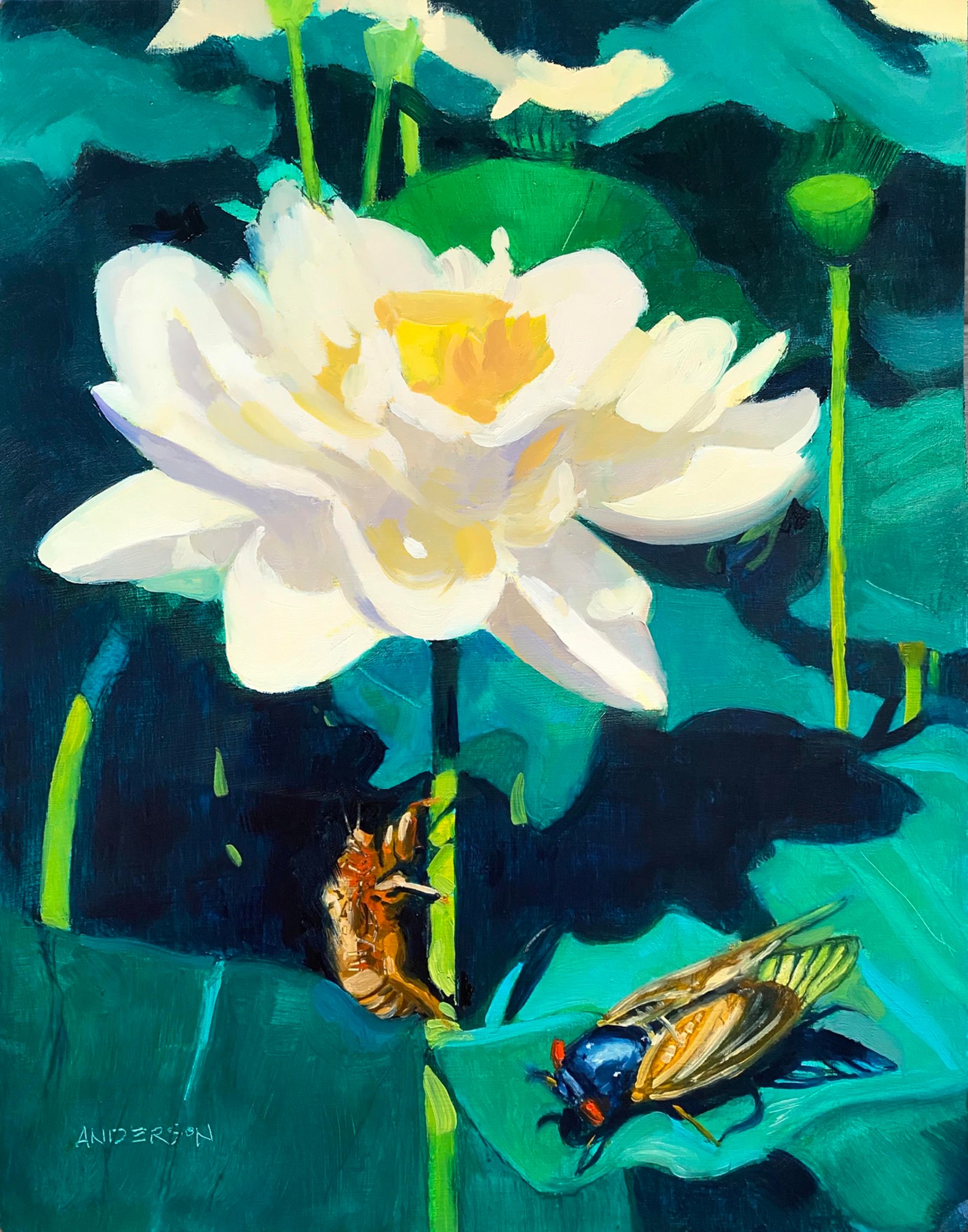 Cicadas have been used in myth and folklore as symbols of carefree living and immortality. Painting sold by Green Door Art Gallery, Webster Groves, MO.