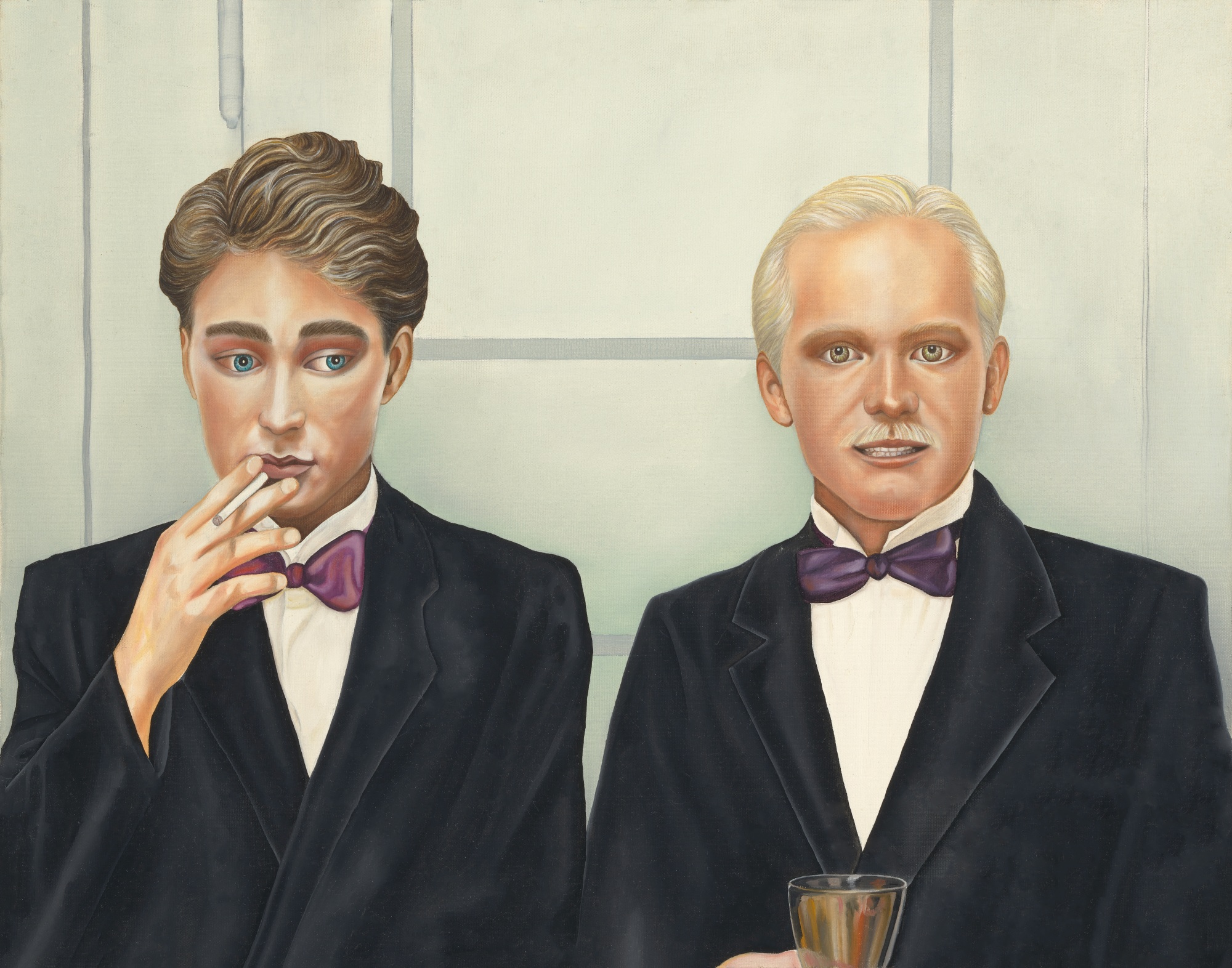 THE MICHAELS | By artist Michael Lawrence. This striking portrait presents two elegantly dressed men, exuding sophistication and charm. The figure on the left, with a contemplative expression and a cigarette delicately held between his fingers, draws the viewer's gaze with his striking blue eyes. Beside him, the second man is the artist himself, stands confidently, a glass of wine in hand, showcasing a warm smile that invites connection. Their formal attire, complete with matching bow ties, enhances the sense of occasion, while the subtle background adds a touch of refinement. This artwork embodies a moment of camaraderie and elegance, making it a captivating addition to any space.