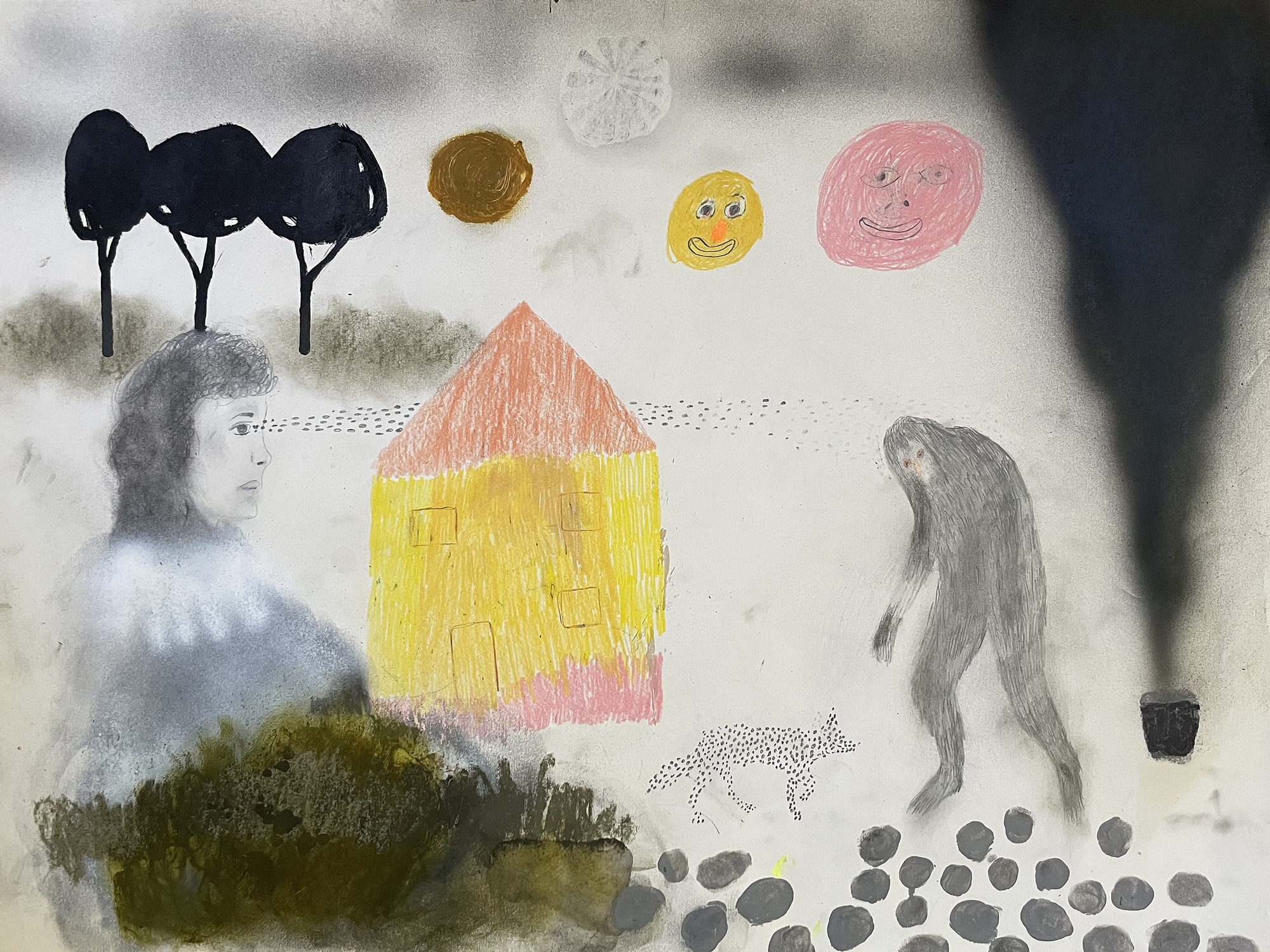 Graphite, acrylic, colored pencil and soft pastel on paper.