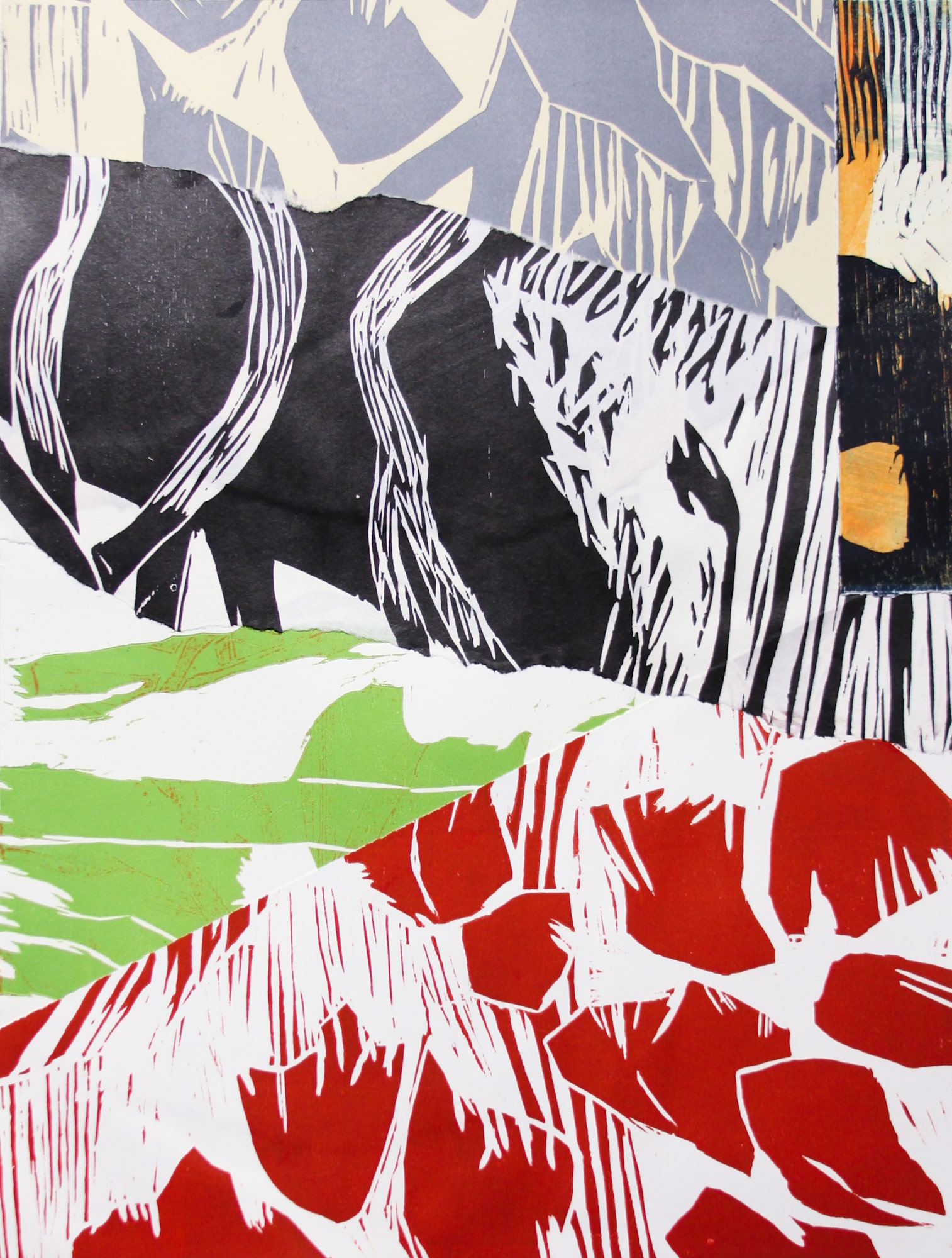 24 x 18", vertical collage on 30 x 22" paper. Made with handmade, original woodcut prints using a variety of Eastern and Western papers. This prints and collages made from them, are inspired by the natural world. Leave, roots and trees are motifs found in the prints in a graphic and stylized way. The process of collage further abstracts the idea of deriving imagery from nature . This autumn series incorporates colored prints as well as black and white, creating a new, painterly direction to the work.