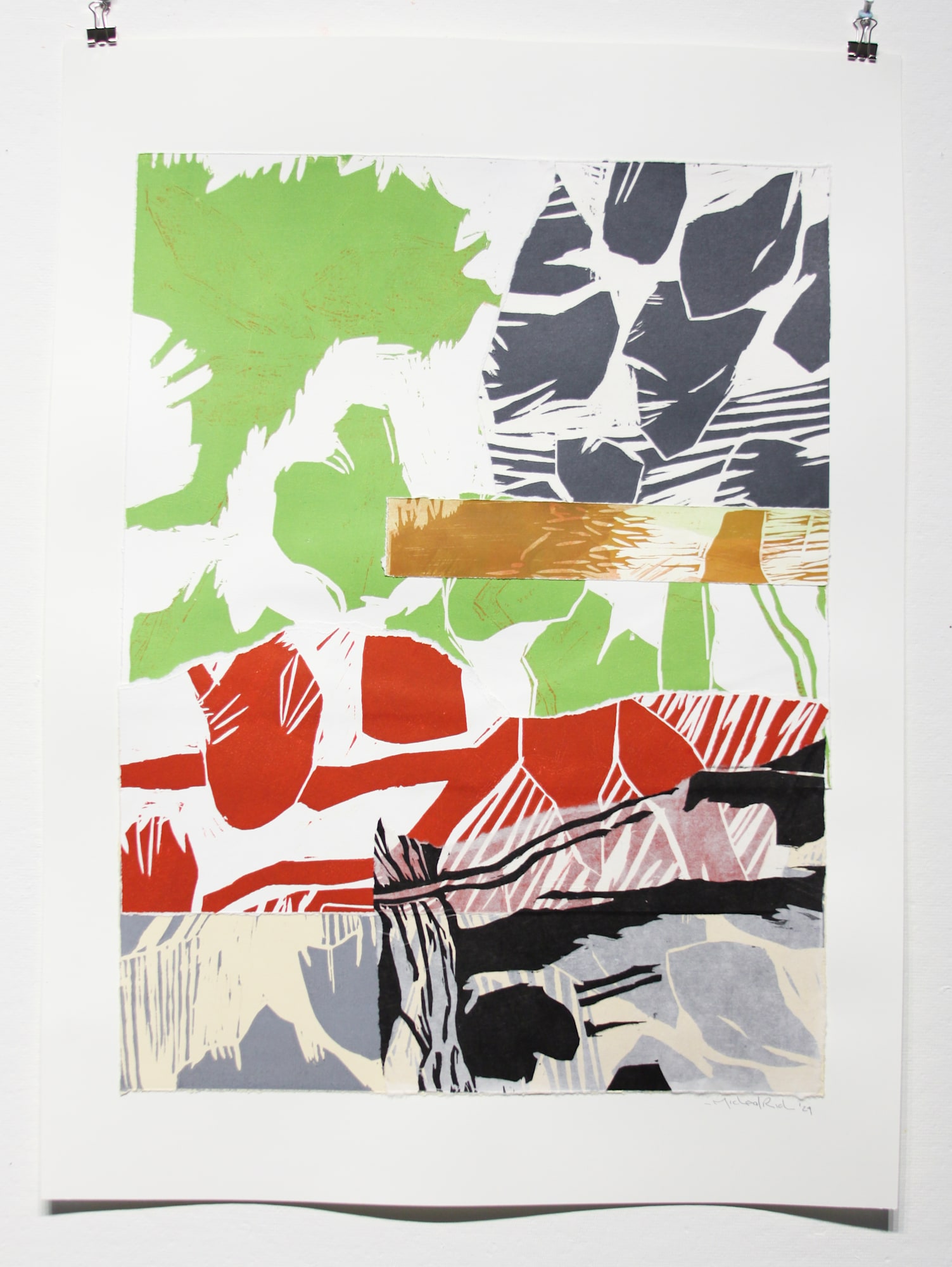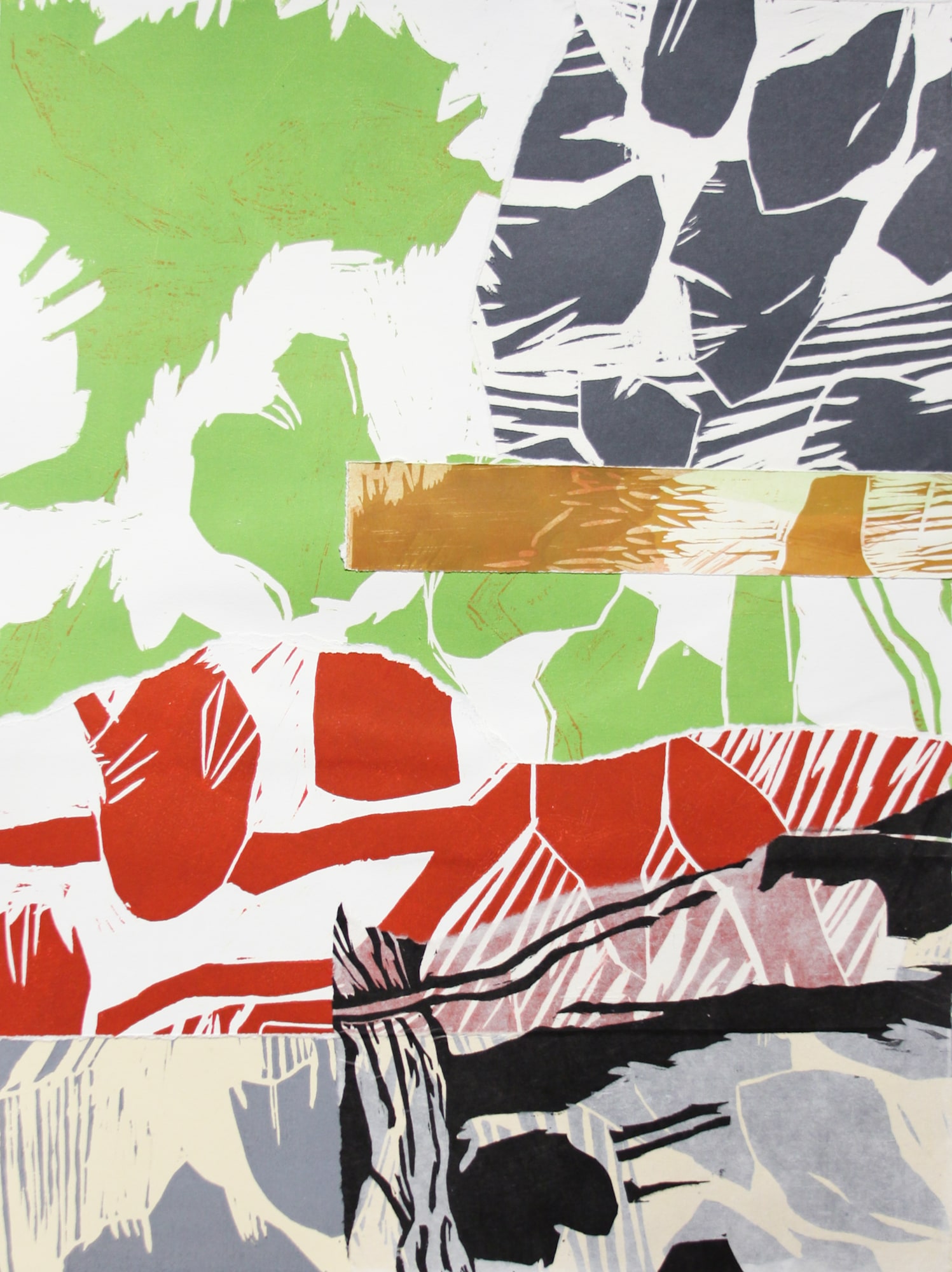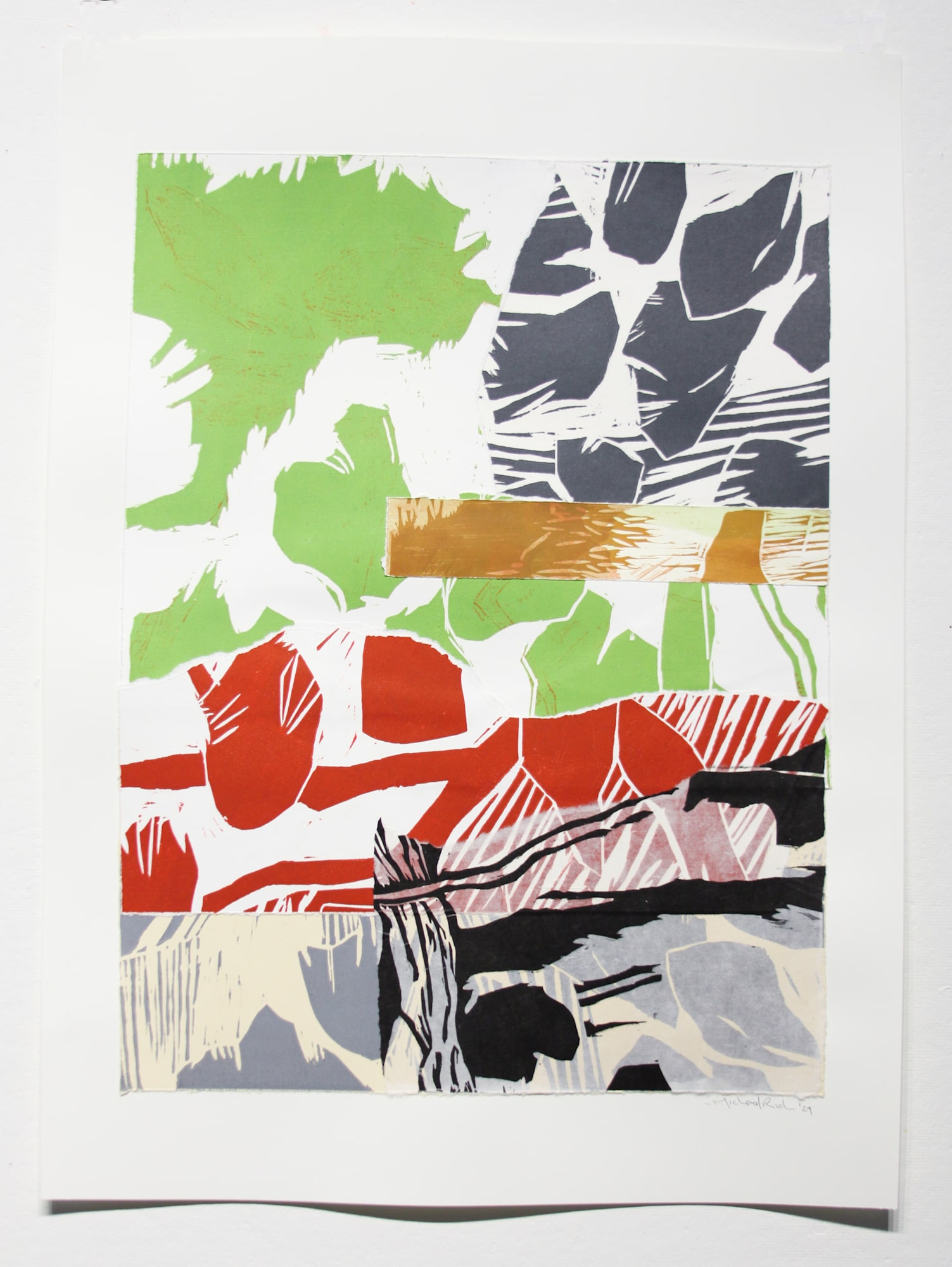 24 x 18", vertical collage on 30 x 22" paper. Made with handmade, original woodcut prints using a variety of Eastern and Western papers. This prints and collages made from them, are inspired by the natural world. Leave, roots and trees are motifs found in the prints in a graphic and stylized way. The process of collage further abstracts the idea of deriving imagery from nature . This autumn series incorporates colored prints as well as black and white, creating a new, painterly direction to the work.