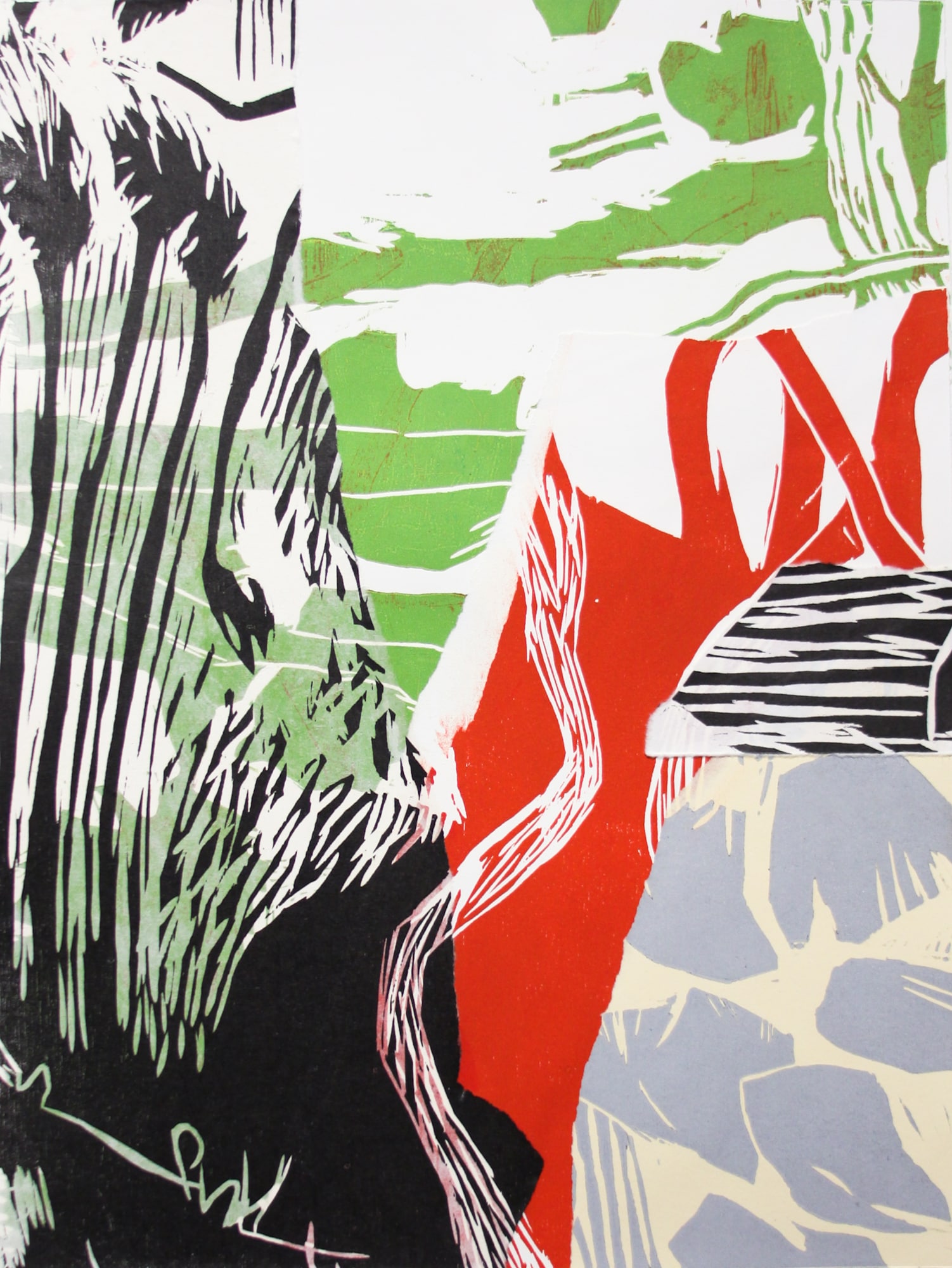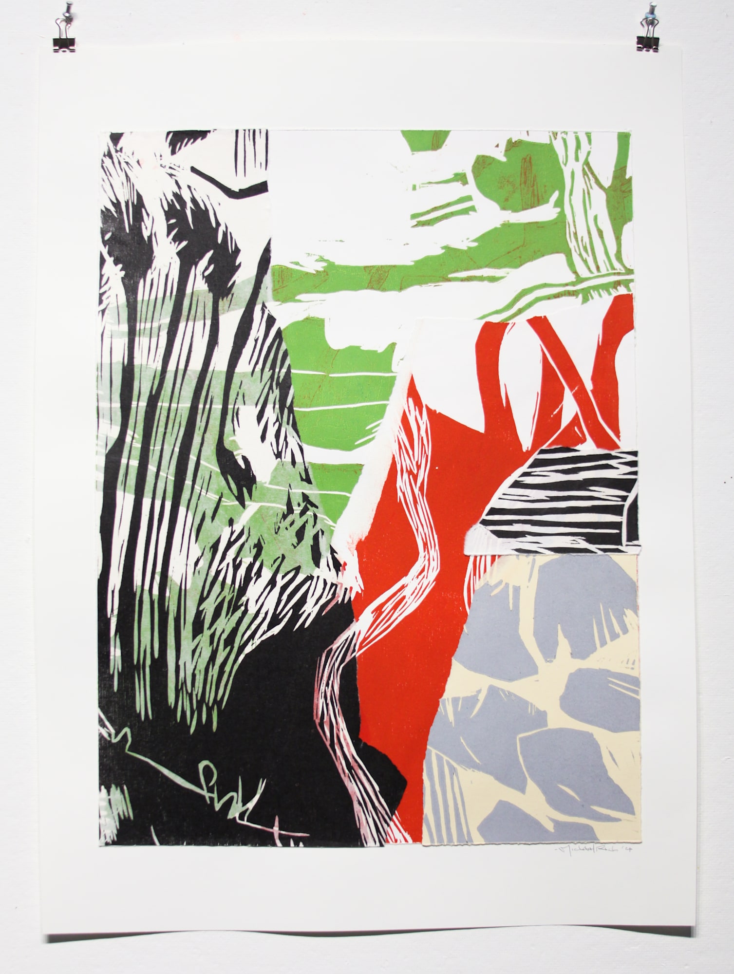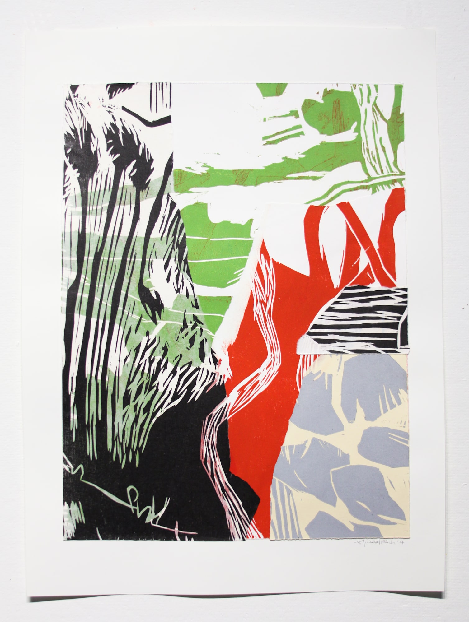 24 x 18", vertical collage on 30 x 22" paper. Made with handmade, original woodcut prints using a variety of Eastern and Western papers. This prints and collages made from them, are inspired by the natural world. Leave, roots and trees are motifs found in the prints in a graphic and stylized way. The process of collage further abstracts the idea of deriving imagery from nature . This autumn series incorporates colored prints as well as black and white, creating a new, painterly direction to the work.