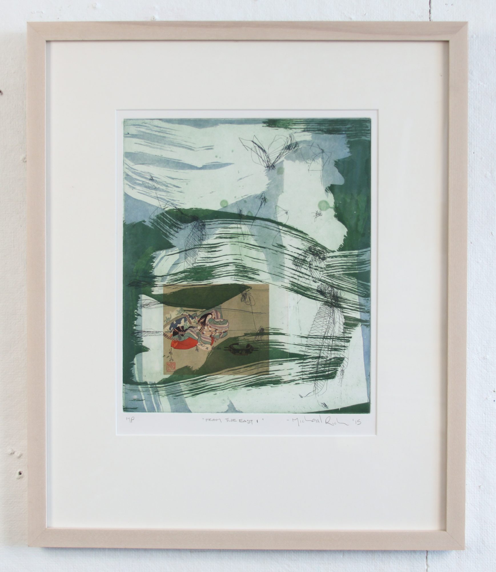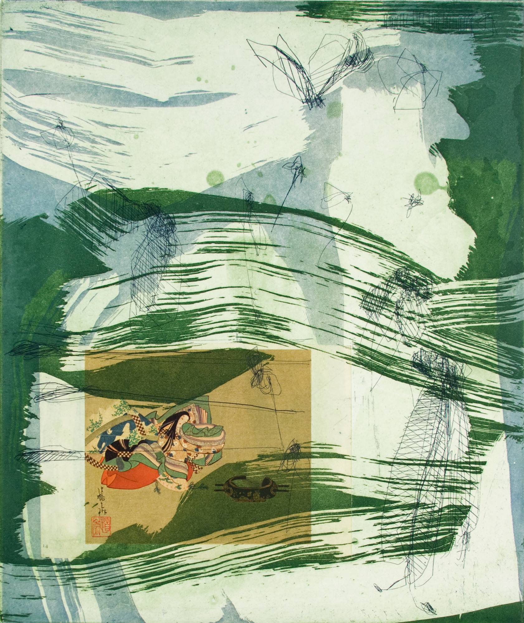 Intaglio monoprint with chin-collé antique art book pages. Each print in the series is a unique combination of intaglio plates and colors. Eastern inspired, recalling Japanese watercolors.