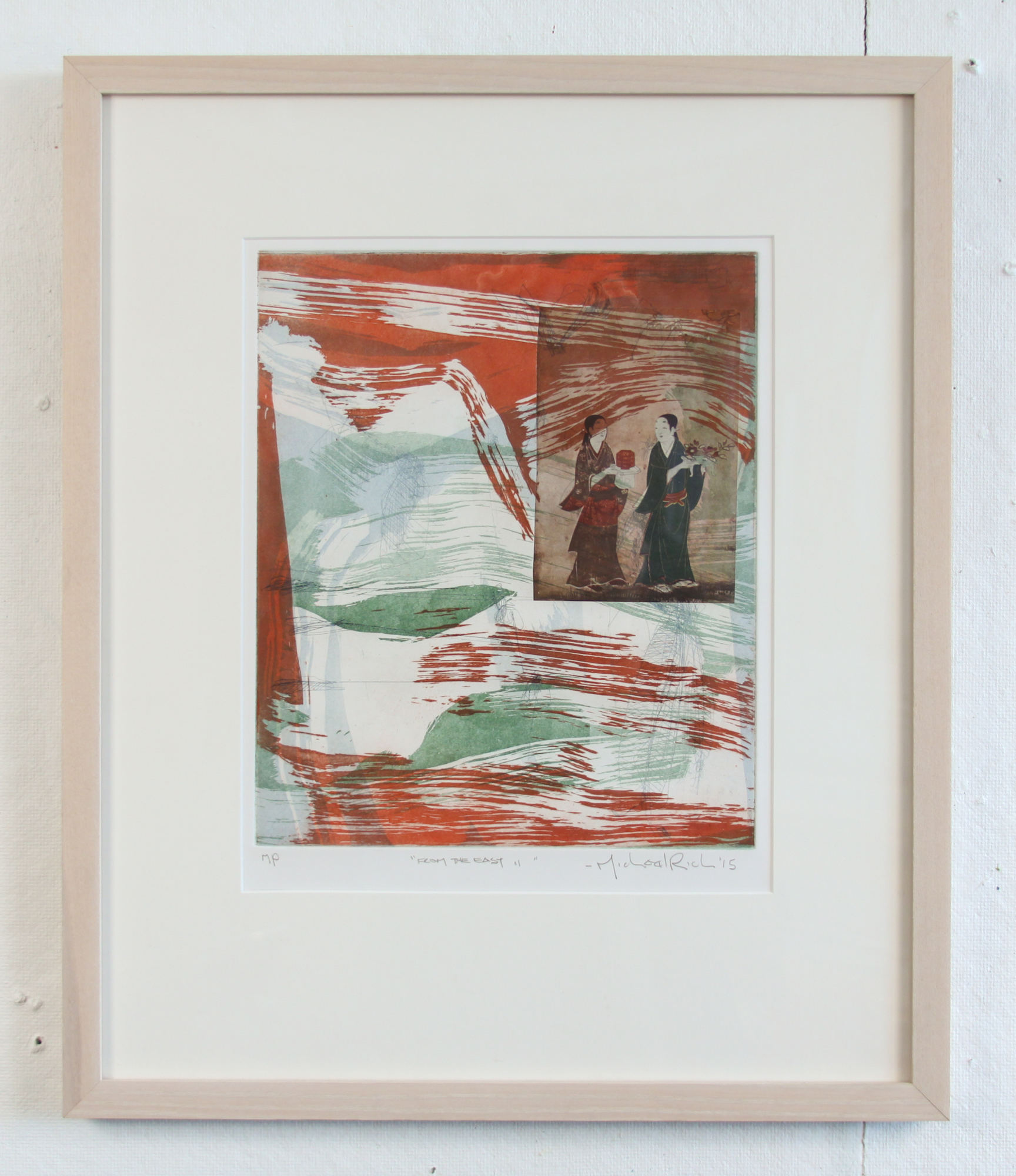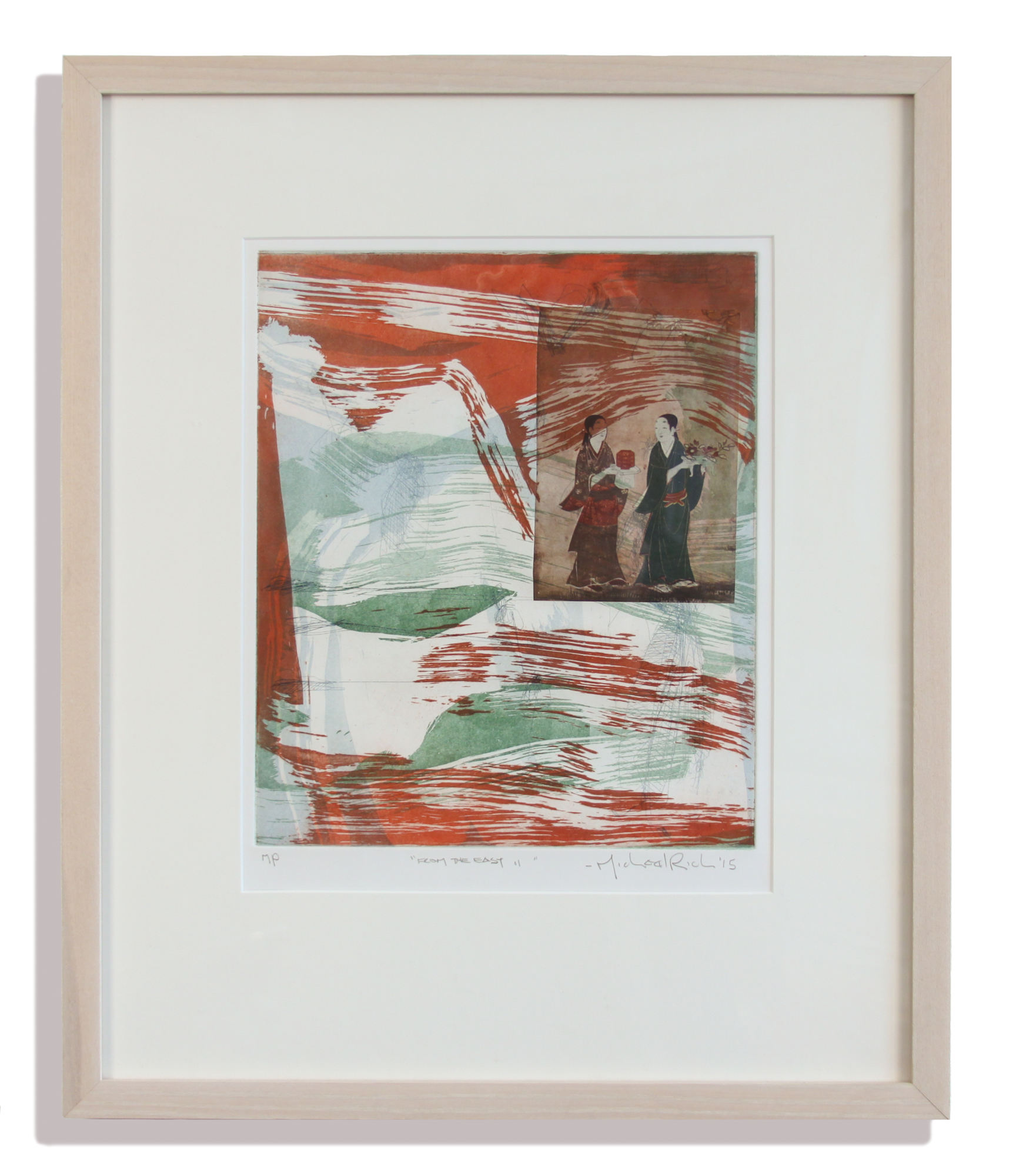 Intaglio monoprint with chin-collé antique art book pages. Each print in the series is a unique combination of intaglio plates and colors. Eastern inspired, recalling Japanese watercolors.