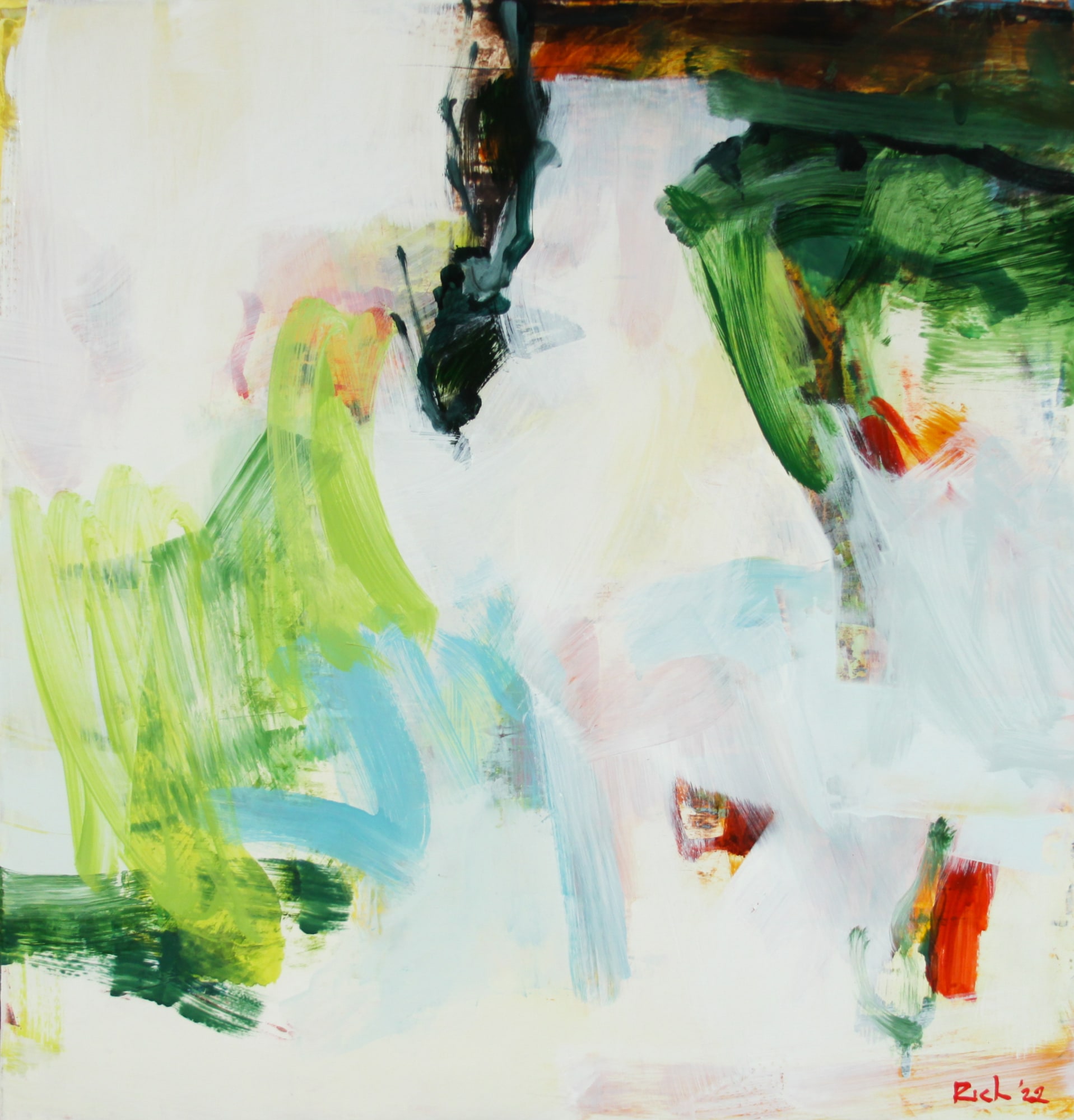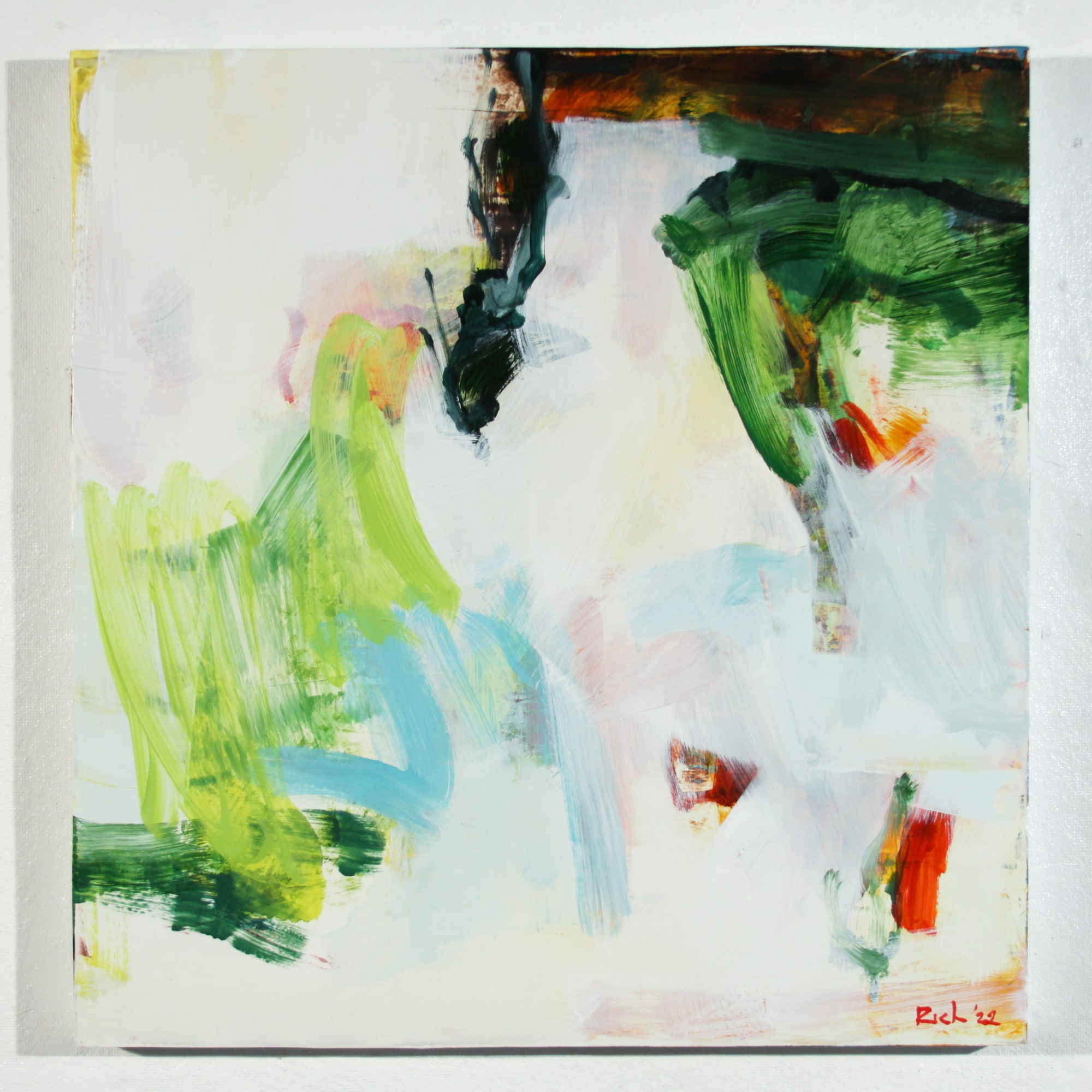 Oil on panel, nearly square, one of a series of 4. This painting has many layers that have been sanded down and repainted, resulting in a surface that is smooth and luminous. Inspired by recent watercolors of the landscape done over the summer. Through an abstraction and simplification, movements of green, blue and red suggest and ethereal landscape of memory.