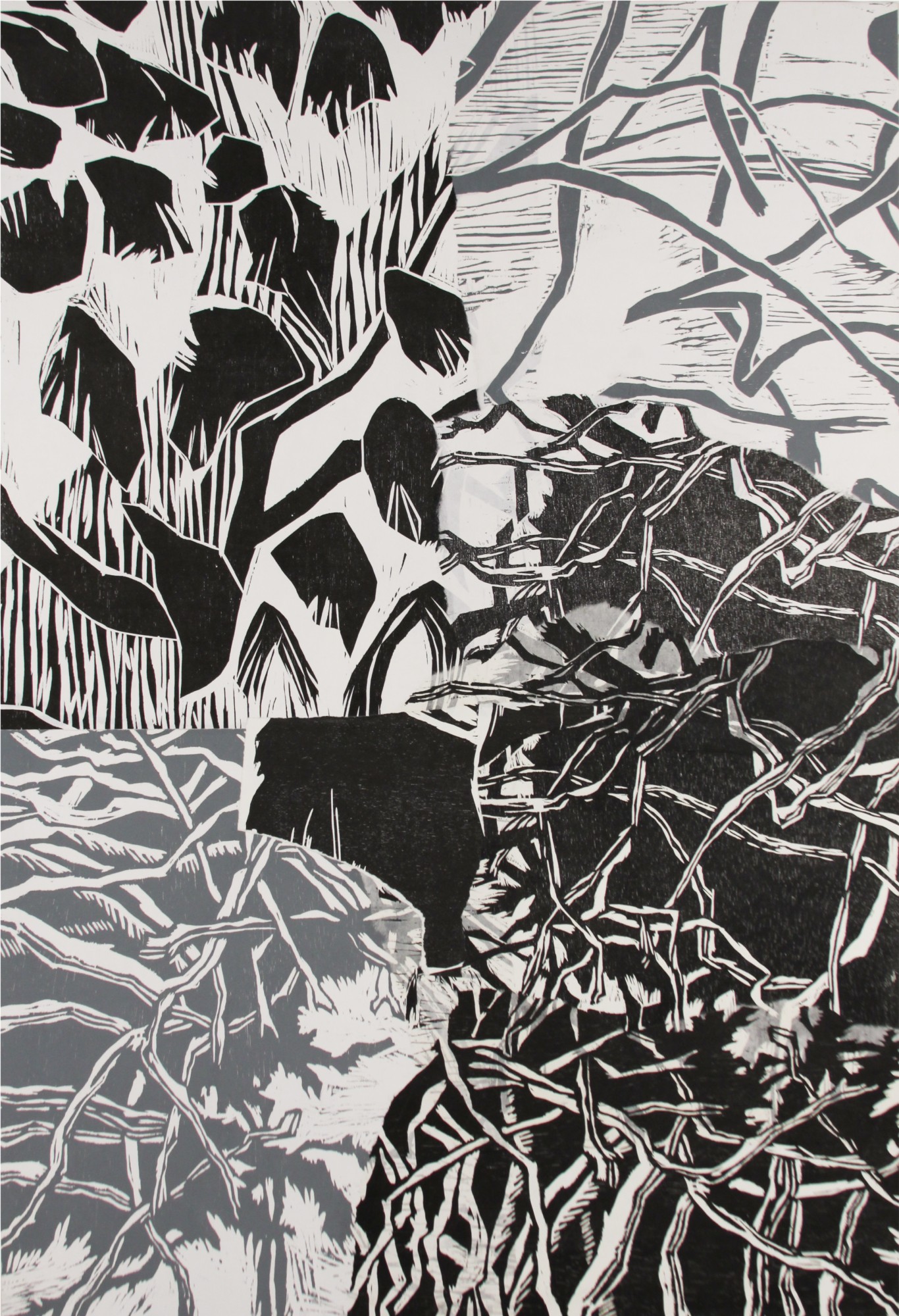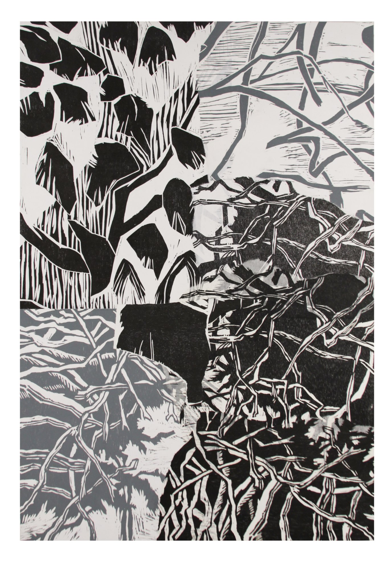 Nesting Season, 2018, woodcut collage on panel, 43.5 x 29.5 in