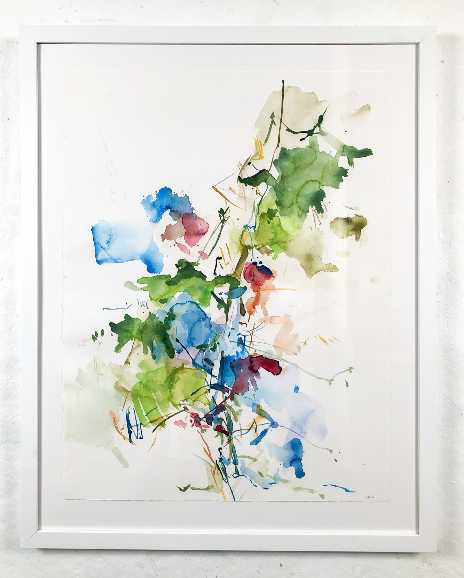 Japanese watercolor on 300lb Arches paper. Painted in the studio in Pawtucket, RI as a remembrance of the trees found in Orquevaux, France. Michael spent September of 2021 as an artist in residence in Orquevaux, much of the time working in the landscape. This work continues the ideas first pursued in France with abstraction through memory and invention added.