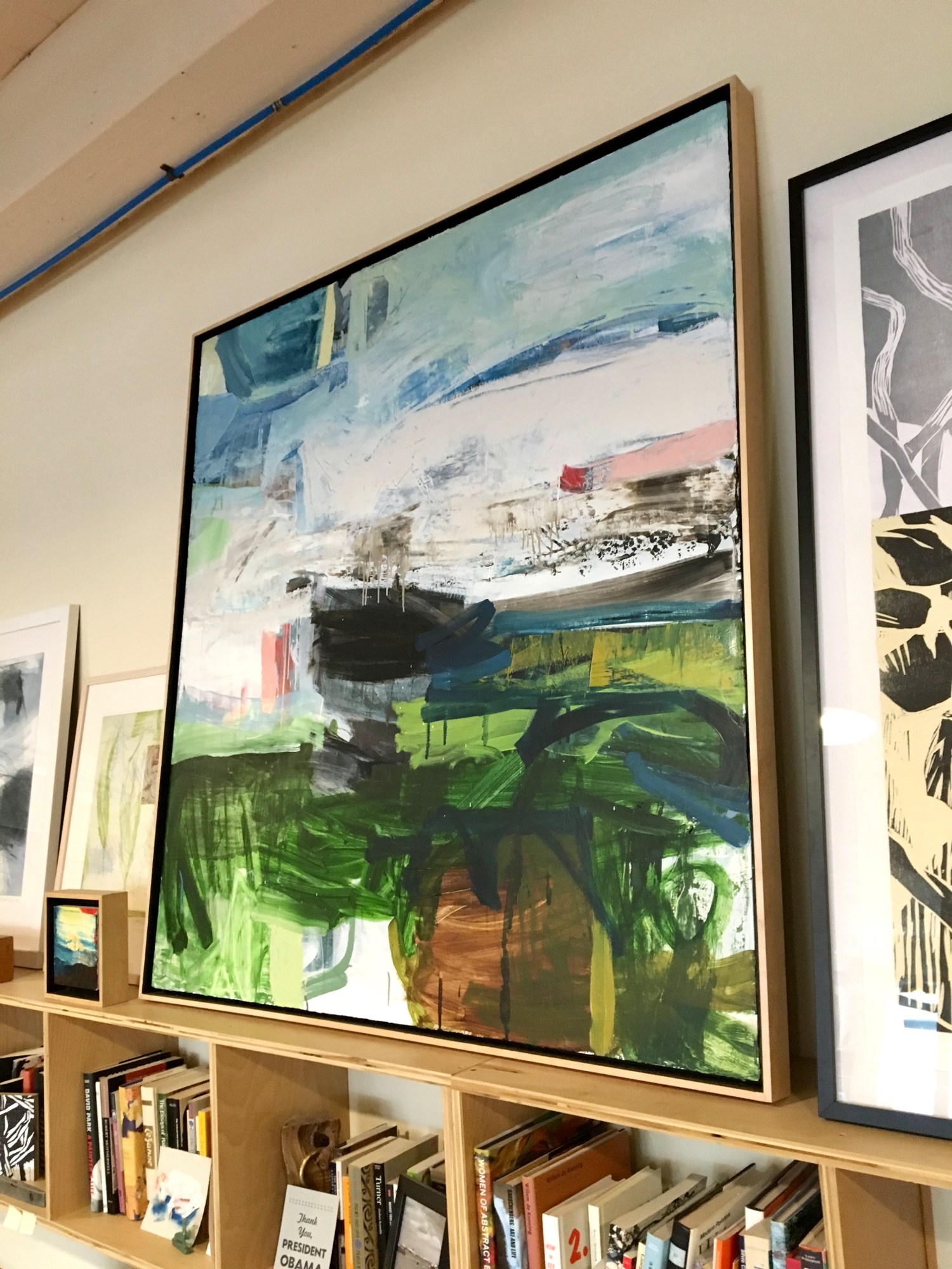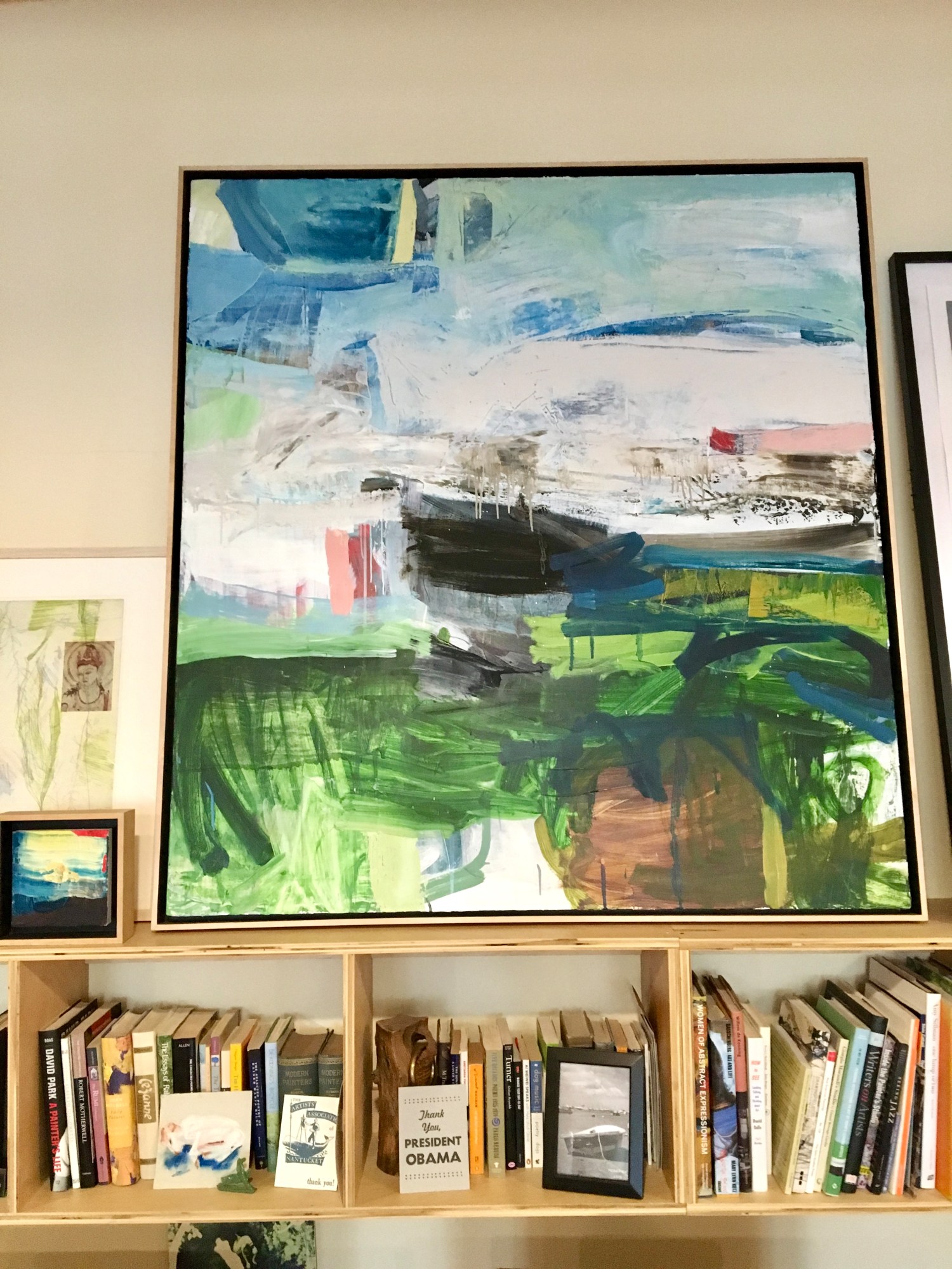 Pastures is a mid-sized, vertical, oil on canvas, original painting by American abstract artist, Michael Rich. An overt landscape painting, the landscape depicted is part invention, part remembered experienced place. Much of Michael's work refer's to the open spaces and moors found on Nantucket Island. The sky, sea and rolling pastures of New England are the subjects of his work. Influences as diverse as JMW Turner and Willem DeKooning, appear in this work.