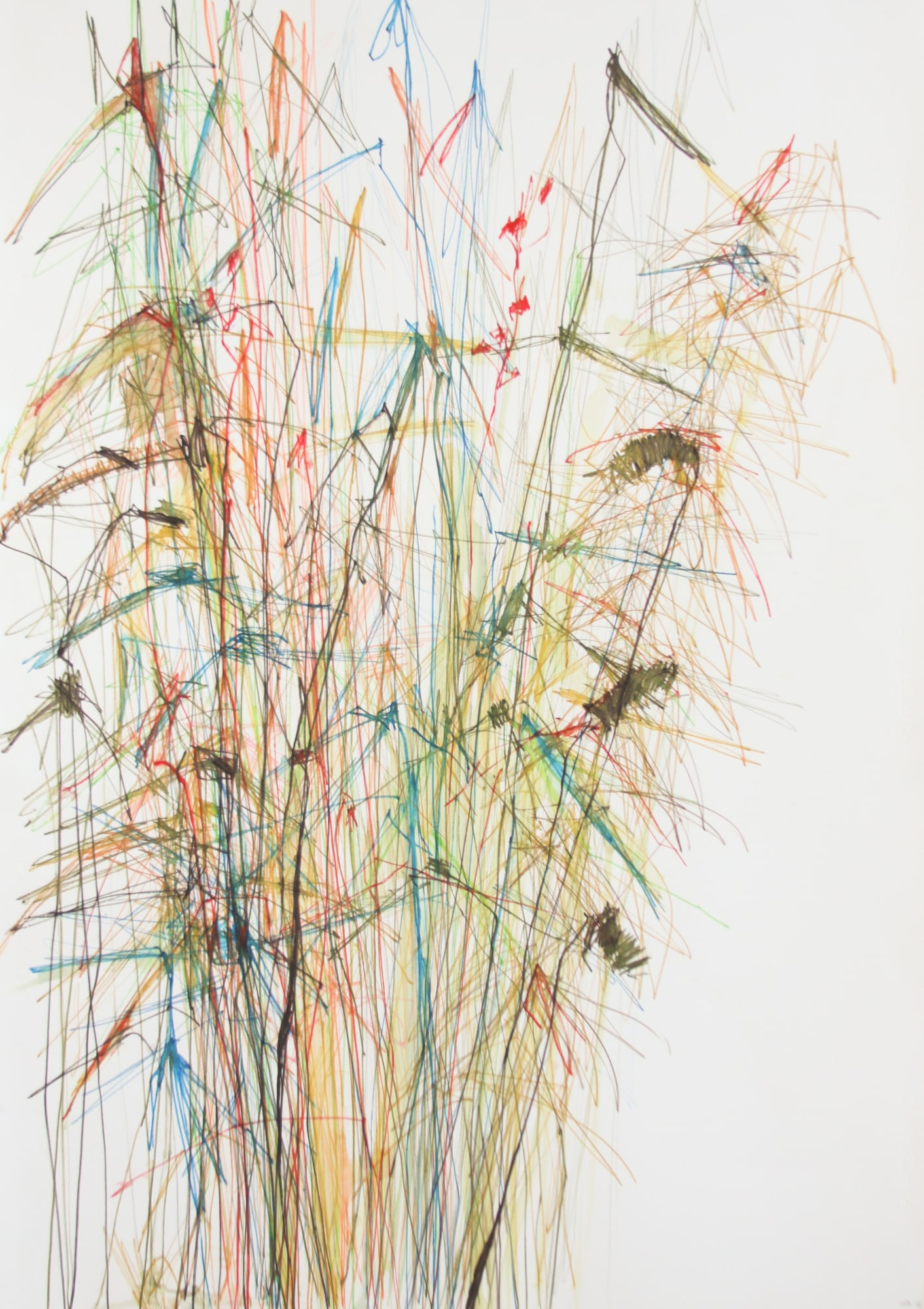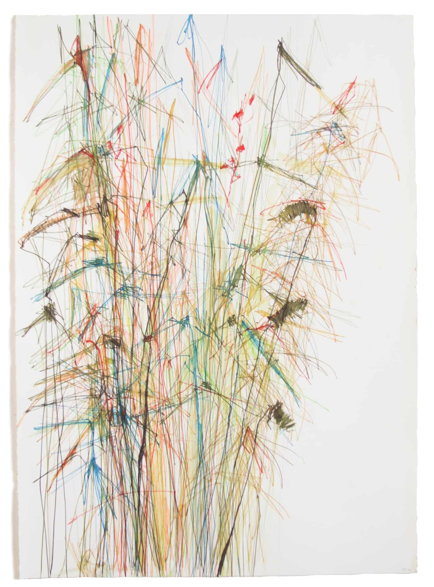 Large, abstract botanical drawing in colored pencil on Fabriano paper. Pink Buds is one of a series of drawings that are loosely based on intimate moments in the natural world. The pink buds of Spring on the trees in the landscape surrounding his home in Providence, Rhode Island are the particular inspiration for this particular drawing. These drawings are not based on direct observation but rather a remembered instance of color and movement in the landscape.