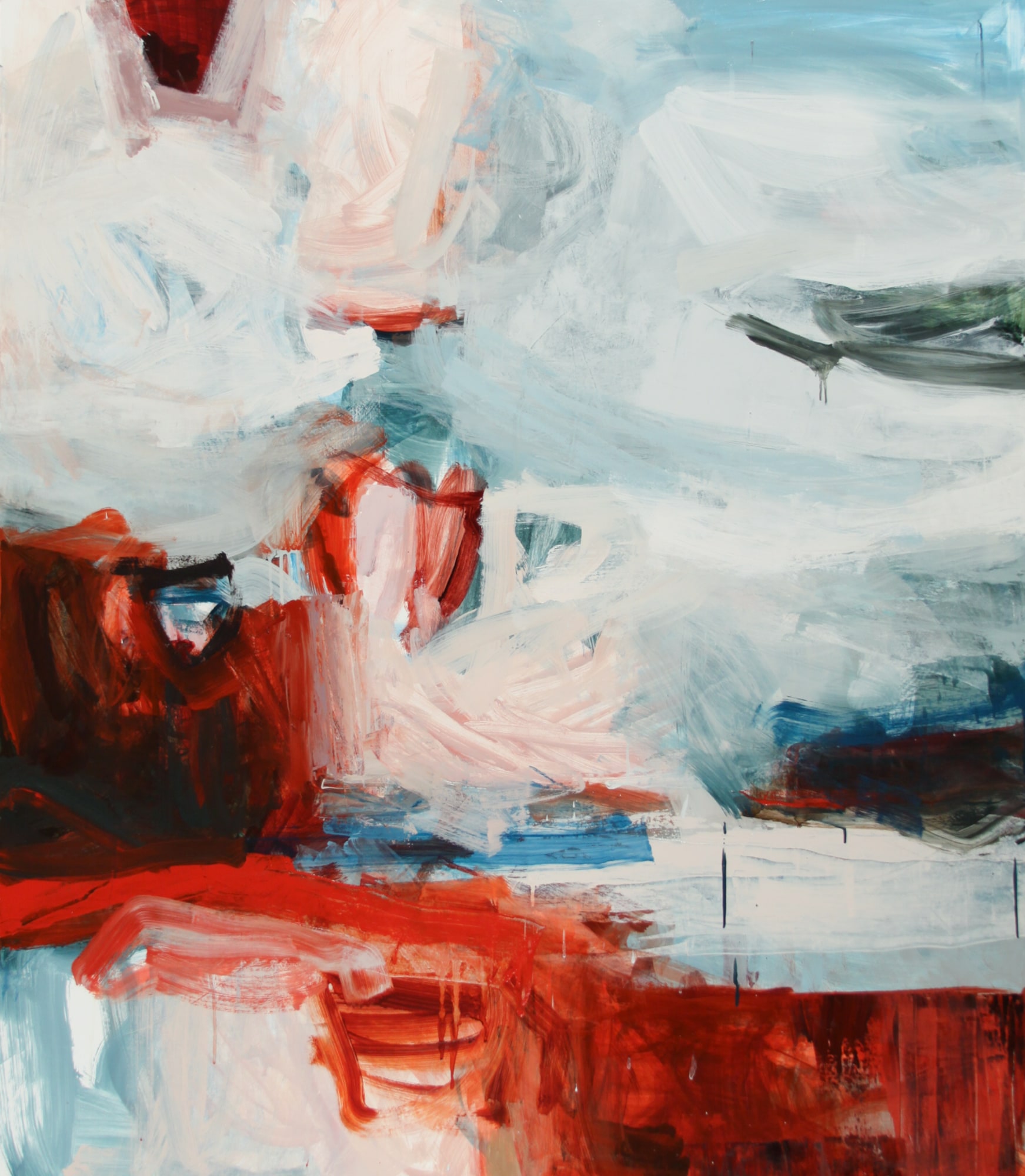 Morning walks along the beach in Nantucket inspired this painting that feels like fog and soft-colored sky. There are dusty pinks in the center of the painting that build this image thematically around the idea of an early morning along the shore. A stunning painting in person.