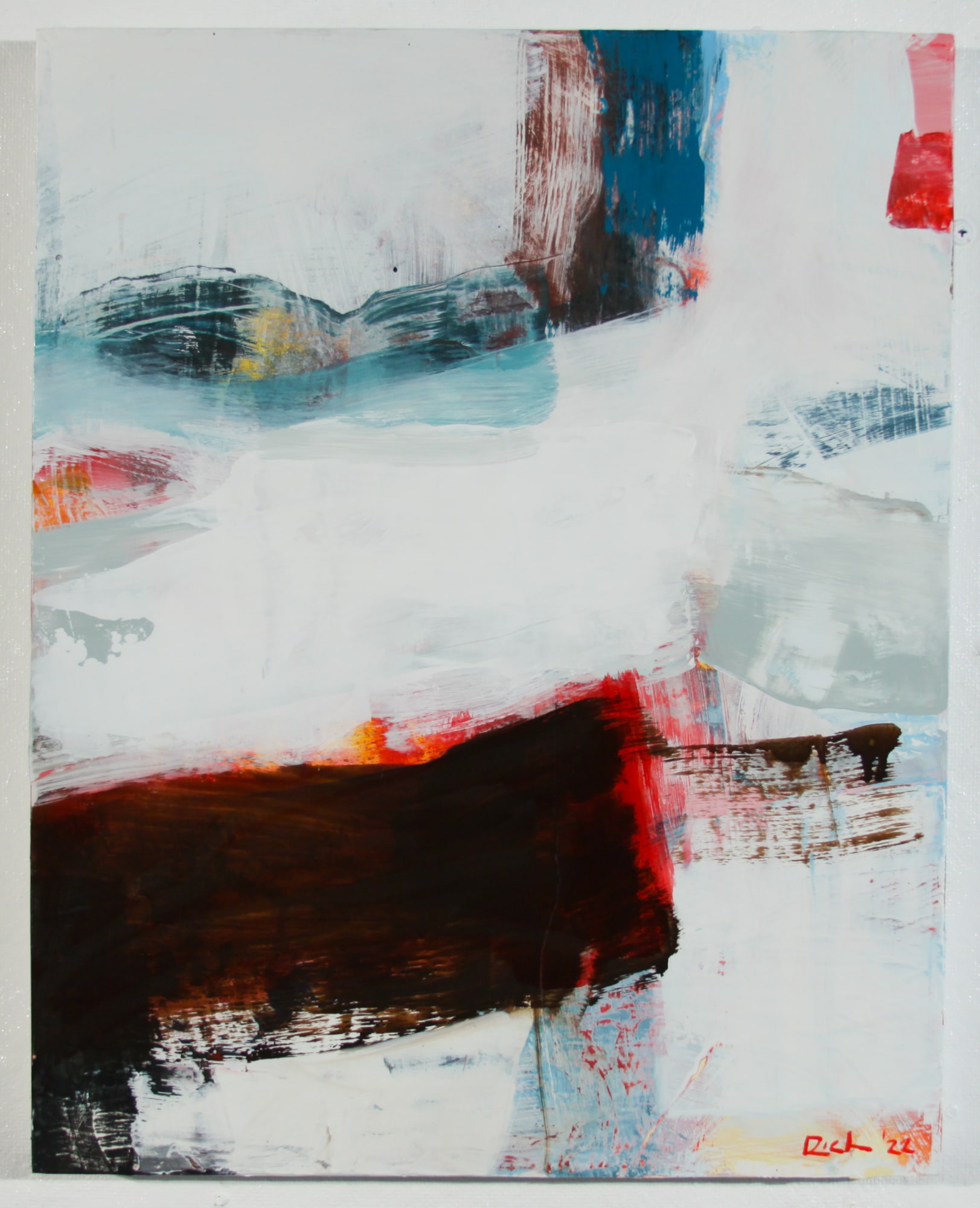 Small-sized, vertical, oil on panel painted in the Pawtucket studio, Fall of 2022. This lush painting, dominated by reds, ruddy browns and blues was inspired by the mid-summer landscape of New England. There are several layers of paint that have been sanded and scraped away to reveal under colors. Glazes of whites and deep rich colors give the surface a smooth sheen while suggesting depth of space. 1 of 2 in a series.