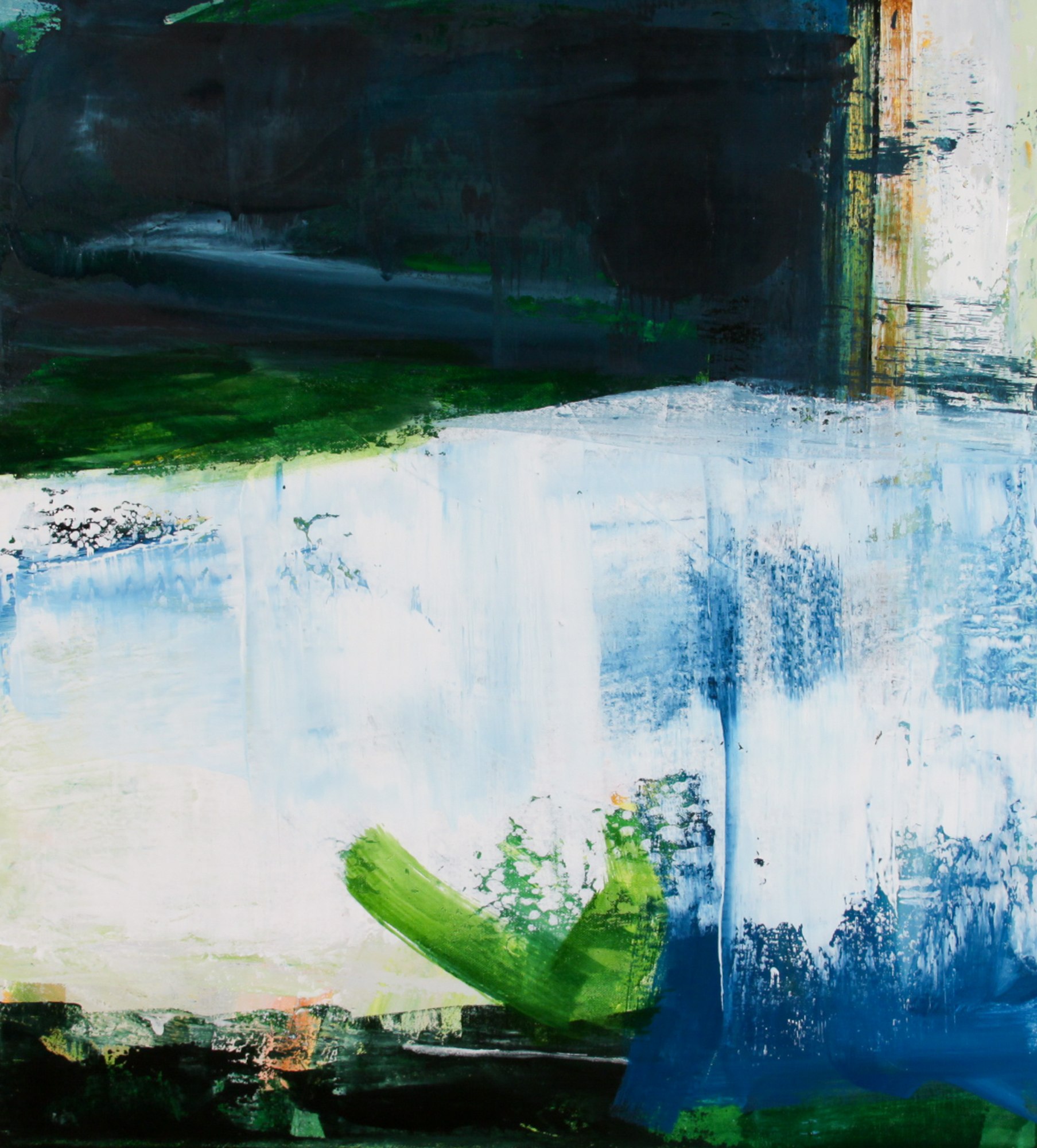 Threshold an intimate-sized, oil on canvas dominated by sweeping passages of white and blackened green. A final note - the small spring of green transparent paint in the bottom evokes a delicate sprout of leaves, perhaps in Spring, on the threshold.