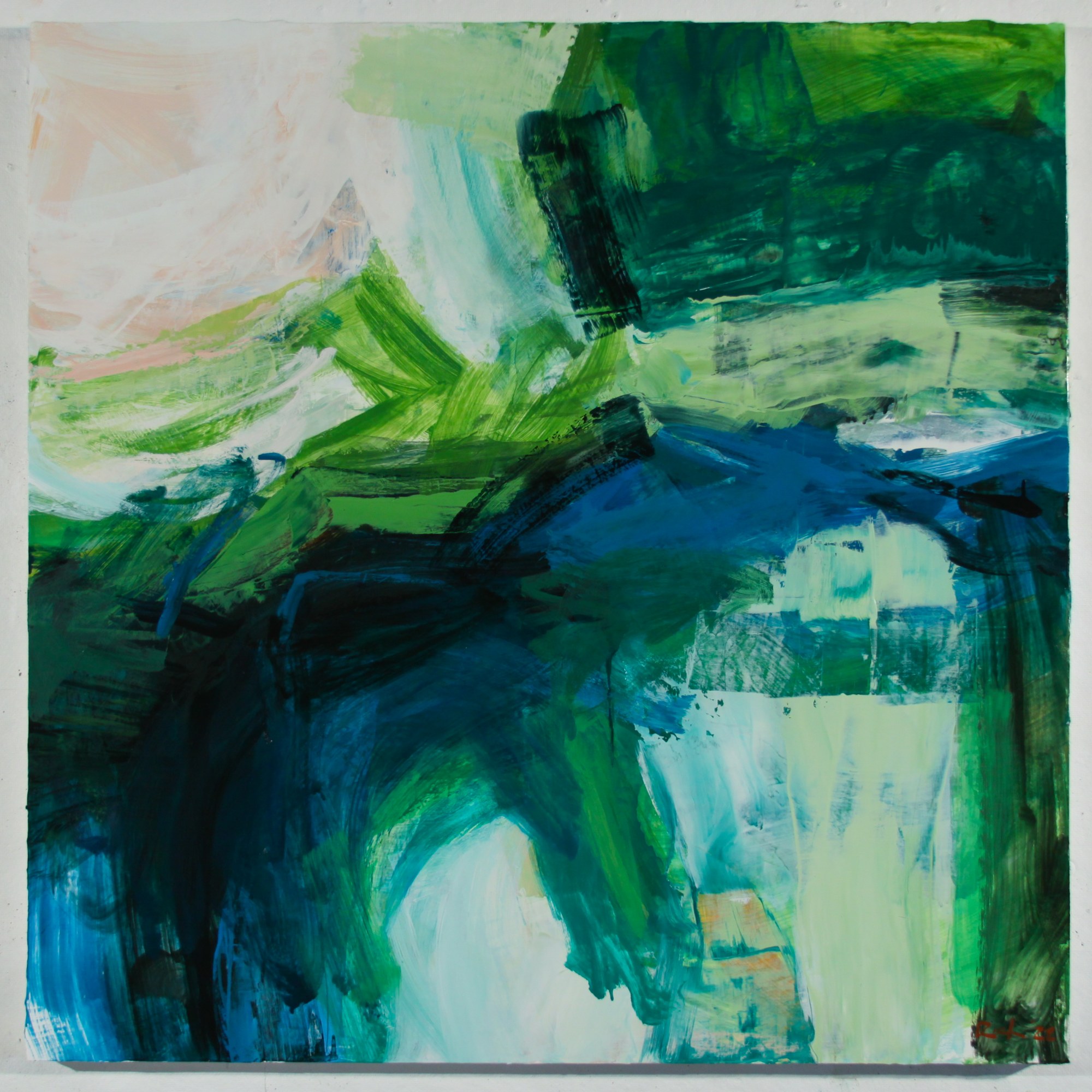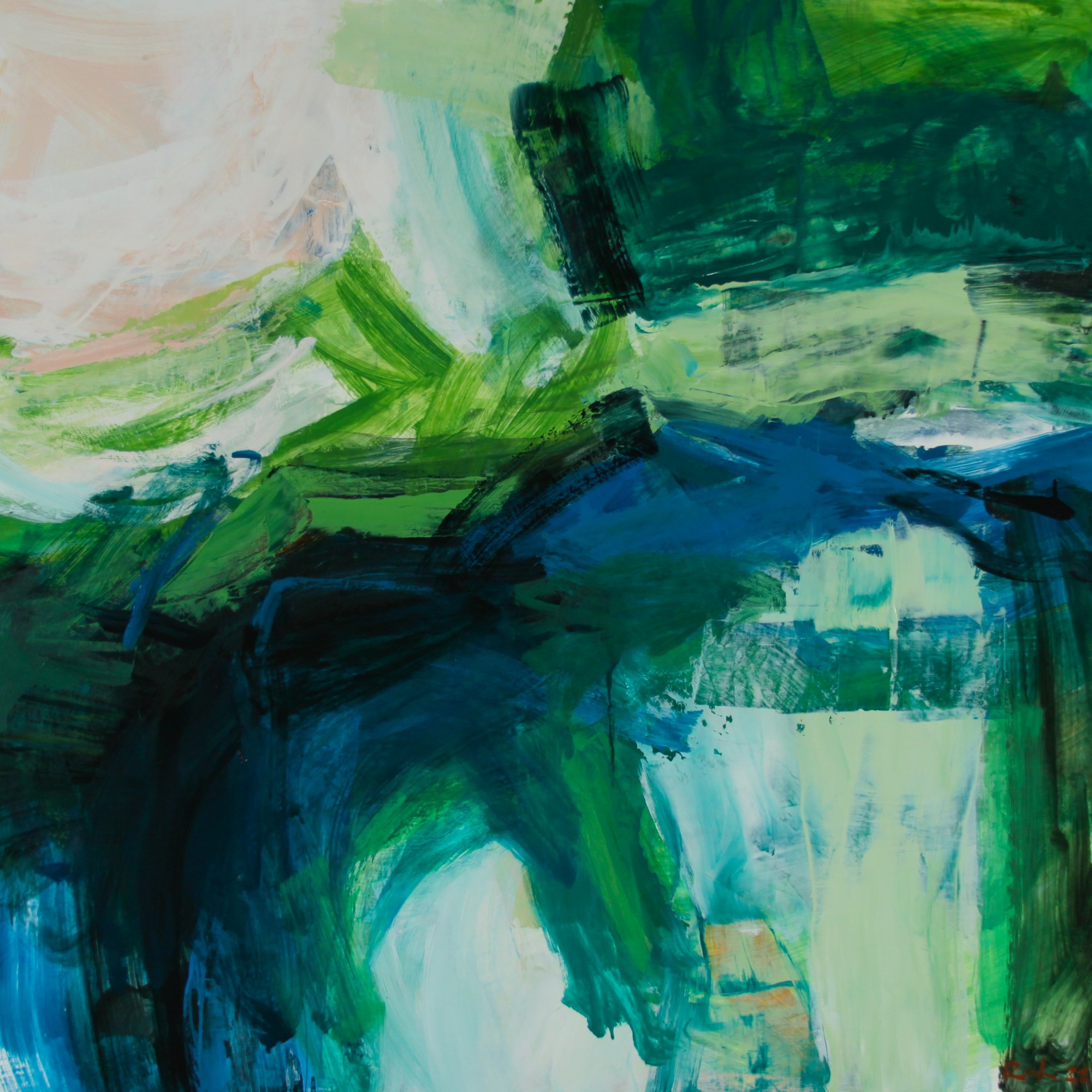Square, oil on panel painted in the Pawtucket studio, Summer of 2022. This lush painting, dominated by deep greens and blues was inspired by the mid-summer landscape of Nantucket, Island.