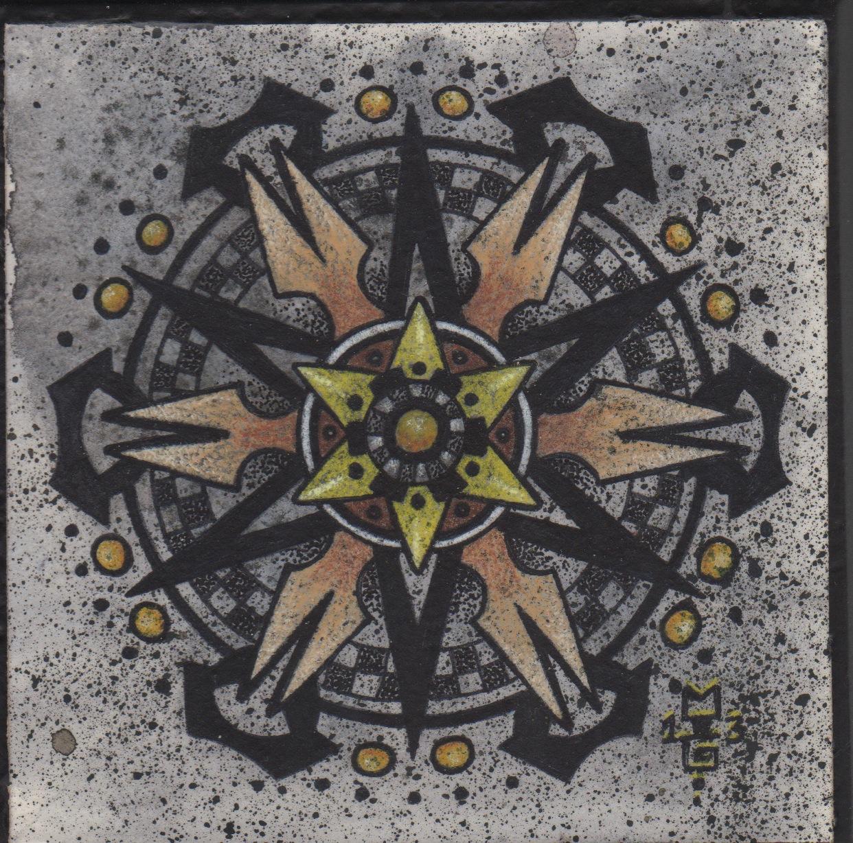 MessageMandala on custom mounted panel in greys, yellows, and oranges