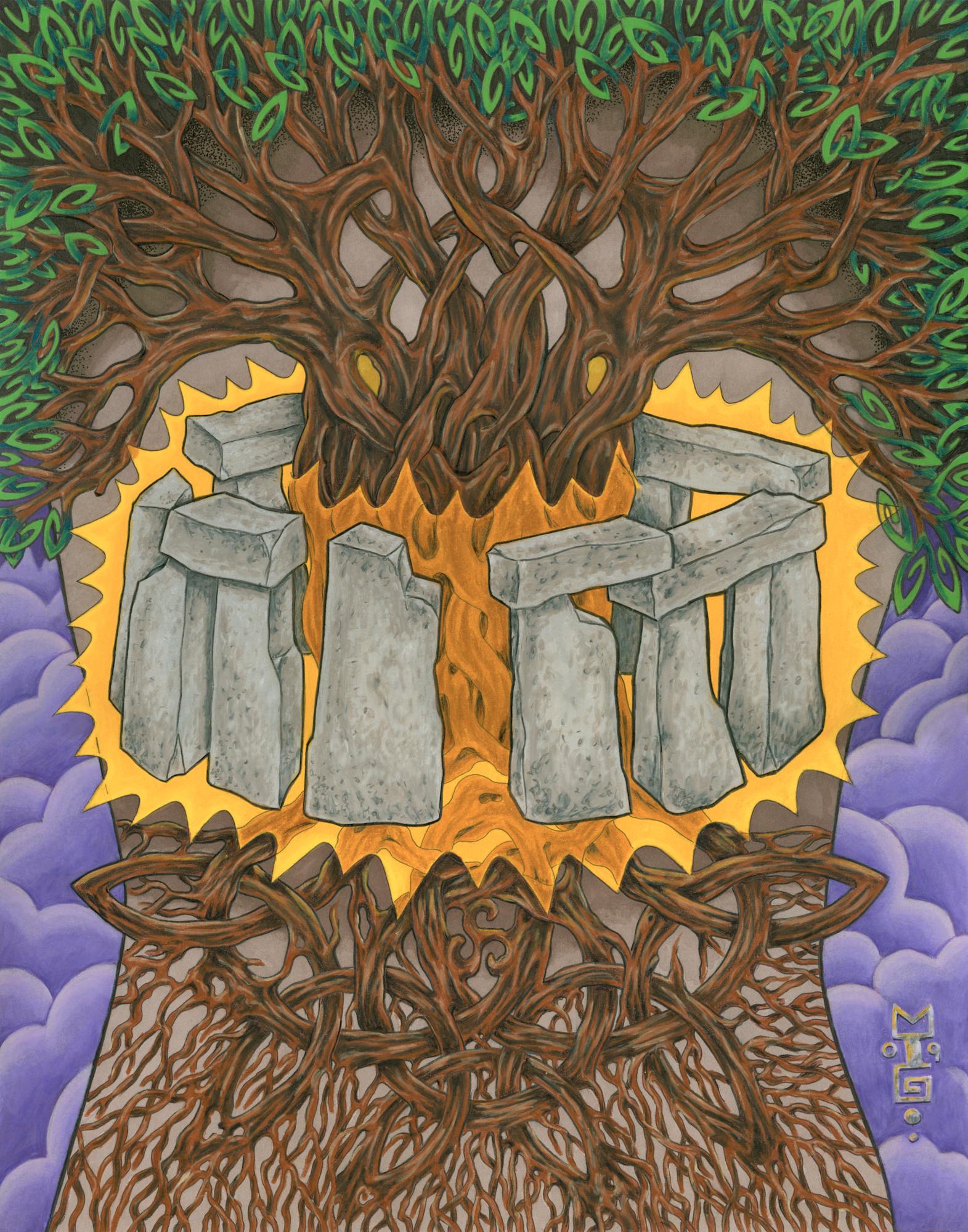 MessageTattoo design for a back including a tree circled by Stonehenge
