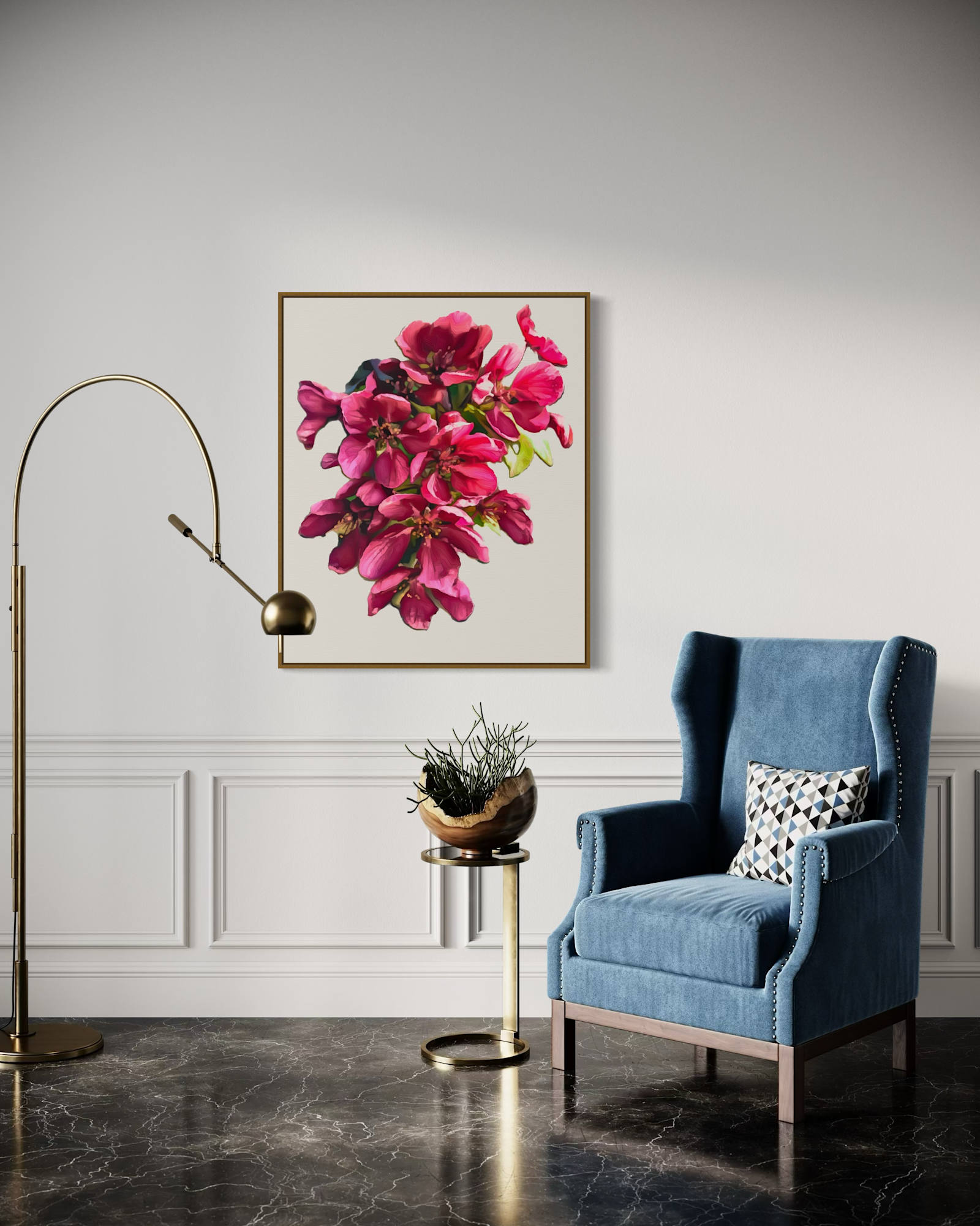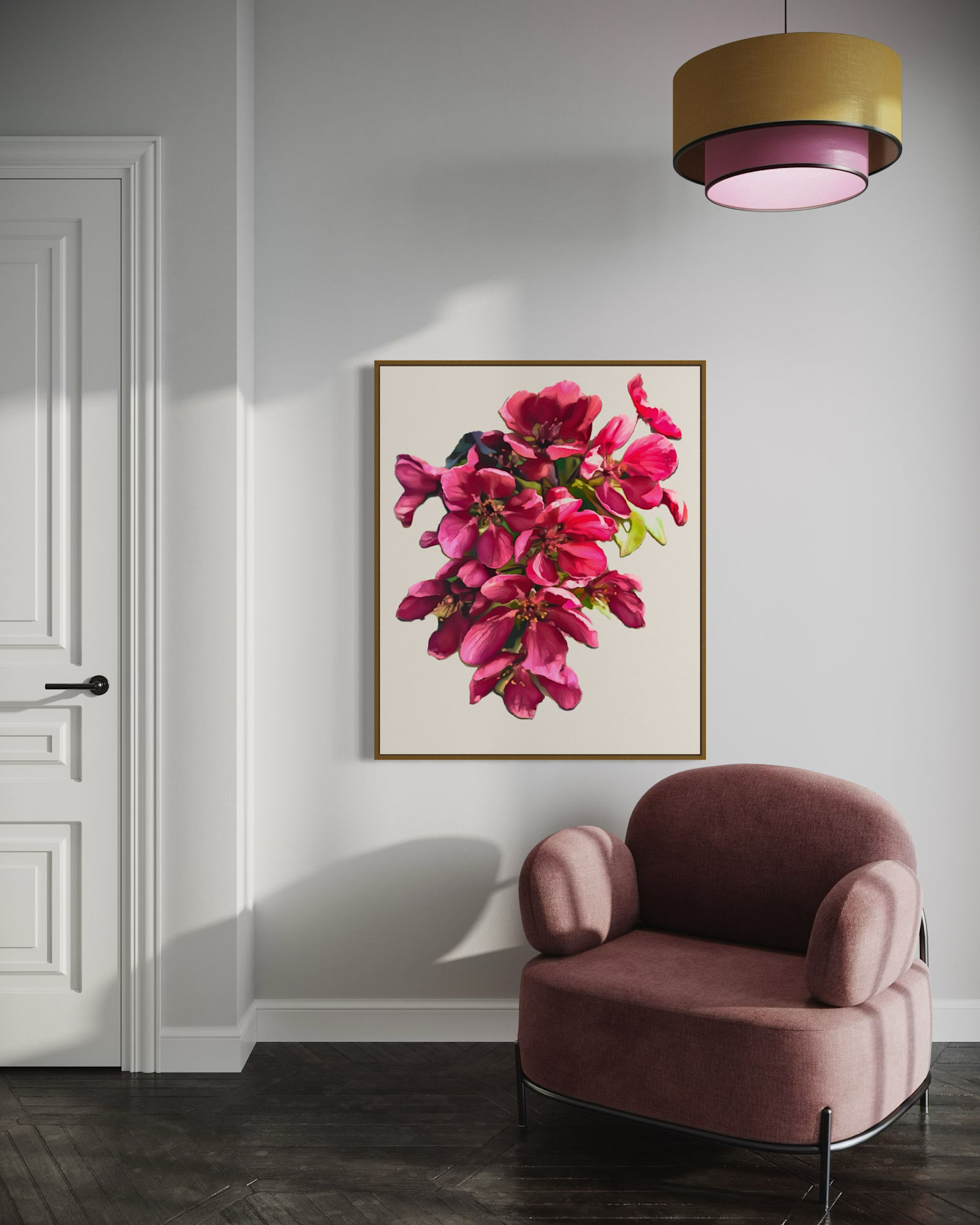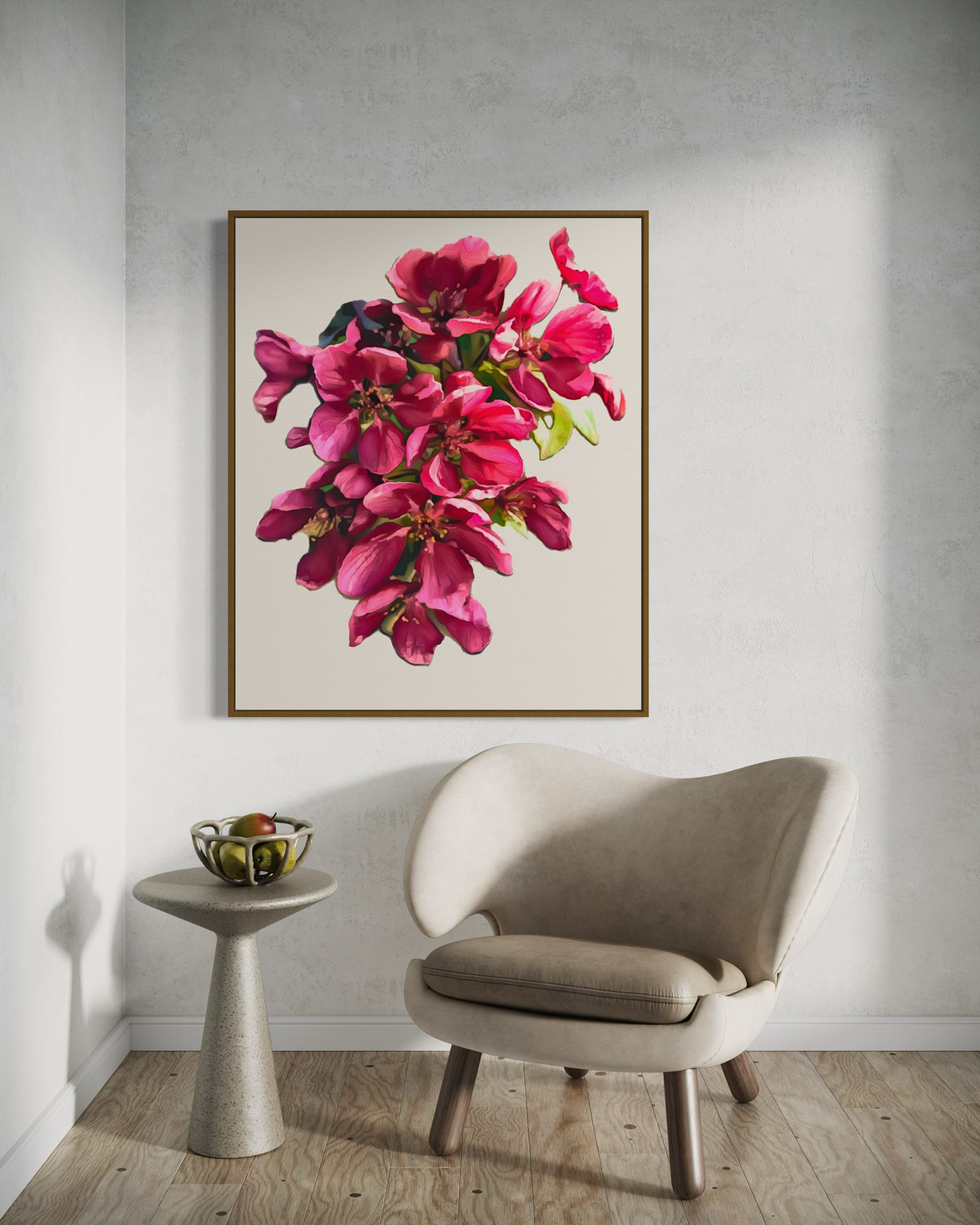 A delicate painting of a blood apple blossom on a plain white background, highlighting the vibrant red petals in a modern style, radiating elegance and simplicity.