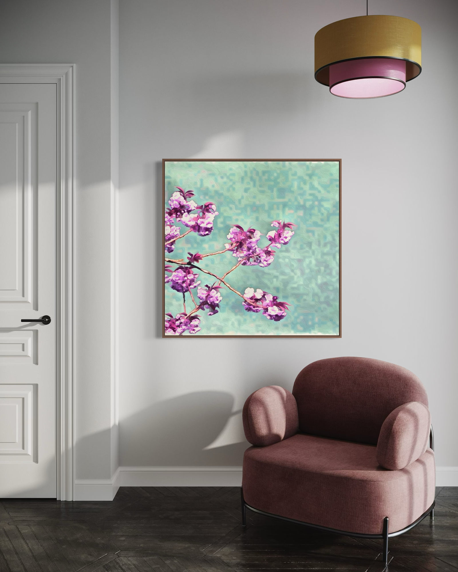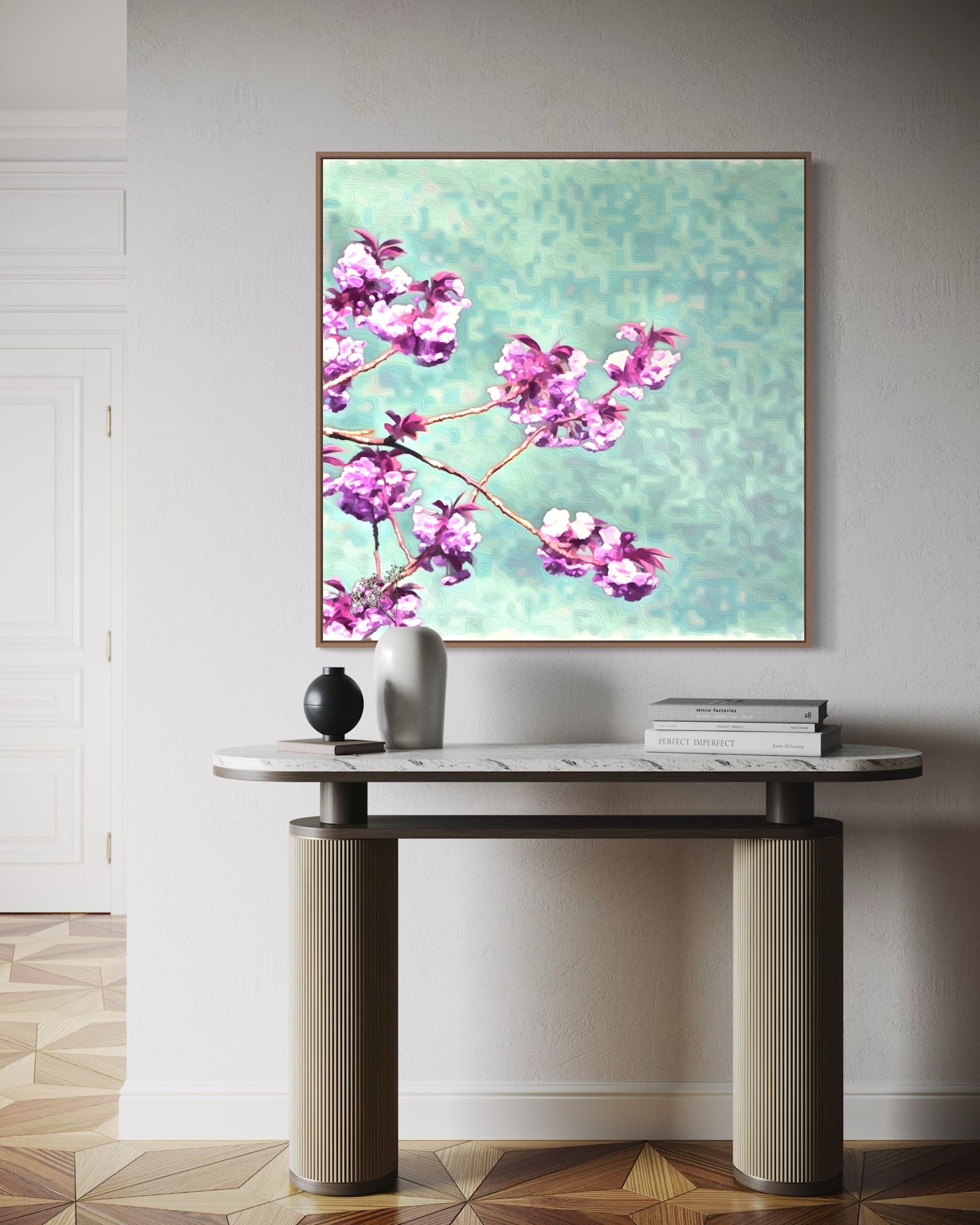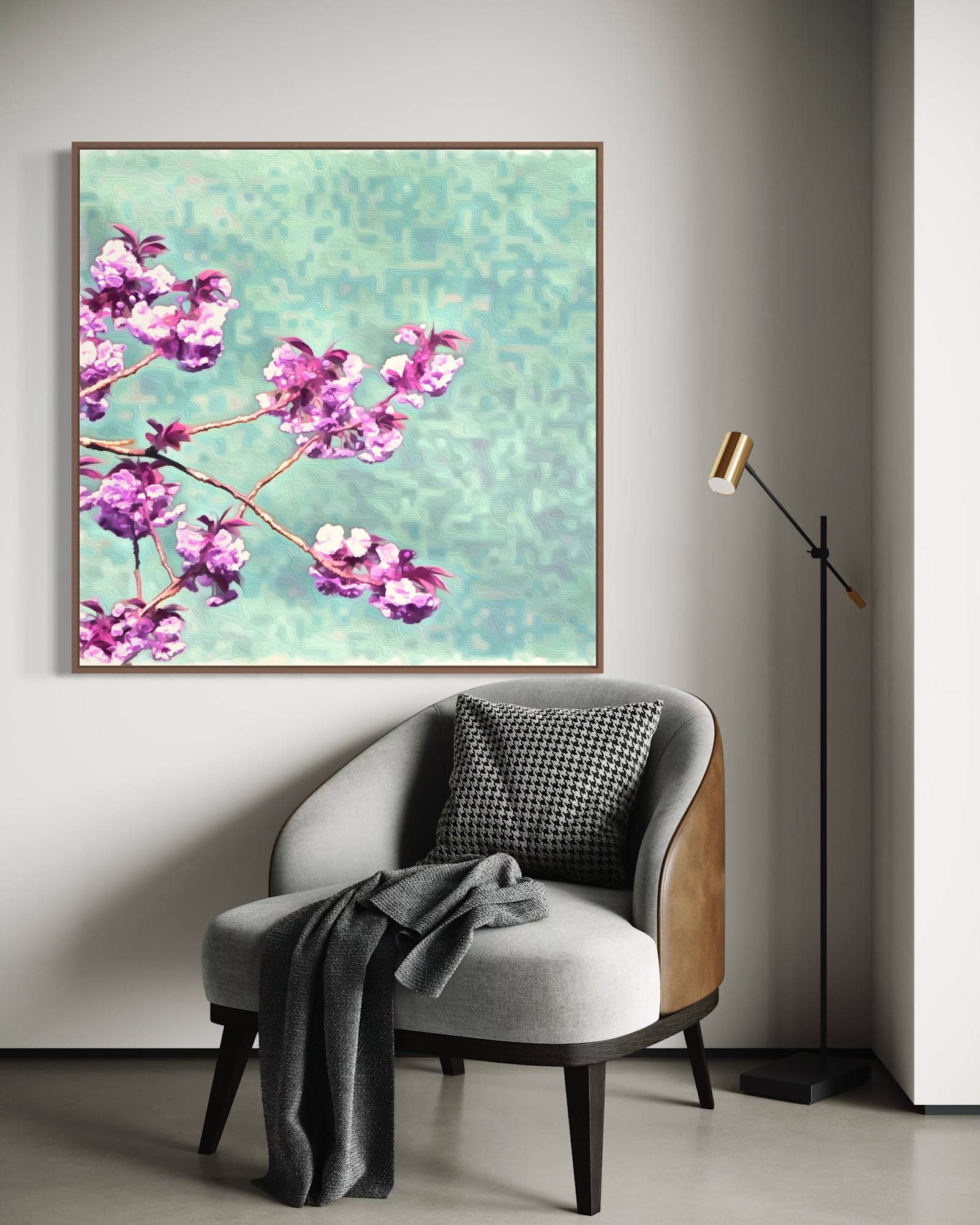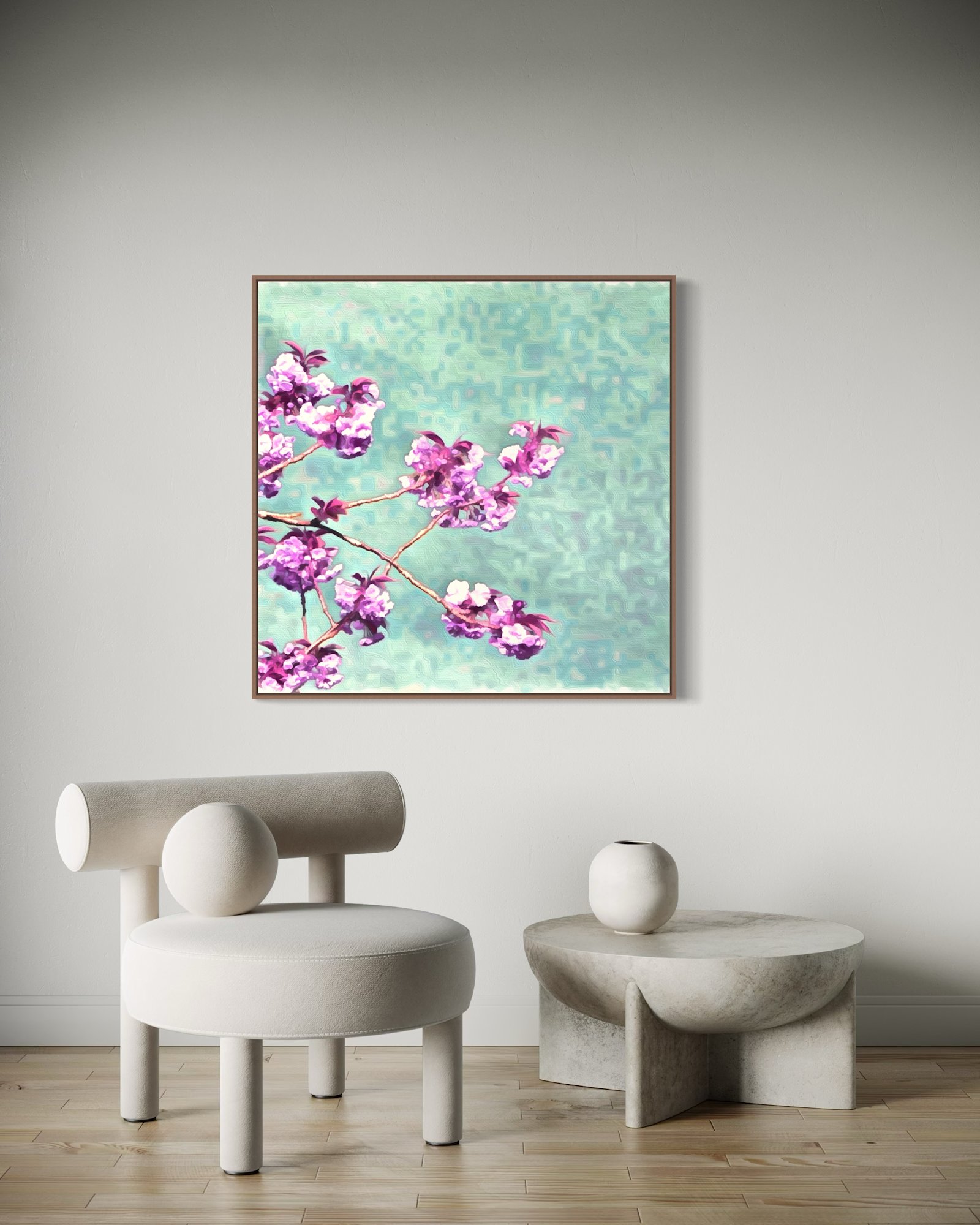 Delicate cherry blossoms against an aqua background, merging vibrancy with tranquility.